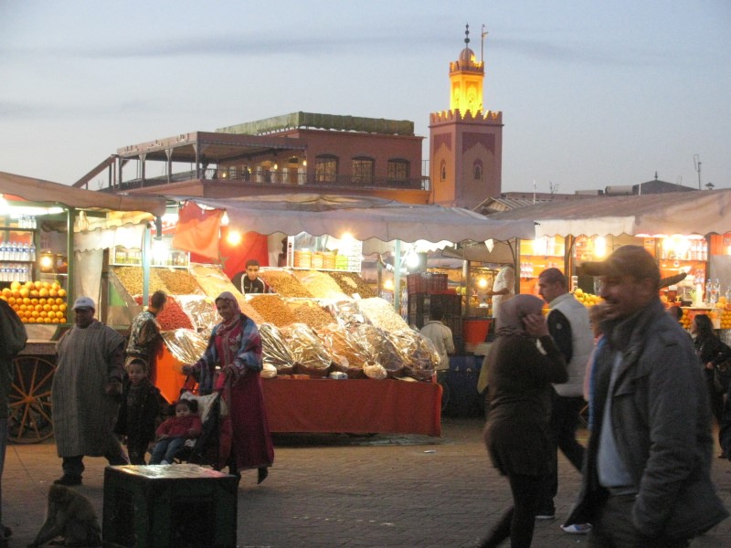 Первое знакомство с колоритом Марокко у нас произошло уже вечером на площади Джамель -Фна. Марракеш – поразительный контраст по сравнению с цивилизованной Европой: попрошайки, вечерний концерт берберов на площади, громадный фастфуд марокканской кухни и громкие зазывалы, дурные запахи подворотен, продавцы гашиша и кареты с лошадьми… У Алёны был культурный шок и в тоже время интерес.