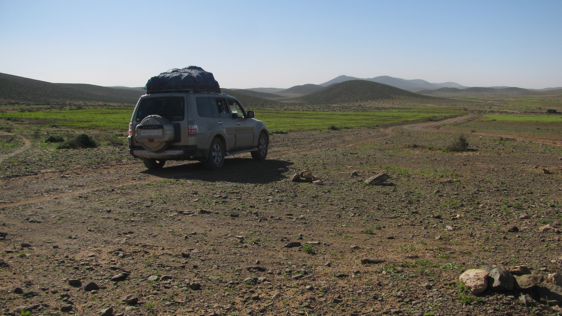 4 января выезжаем в открытые просторы Малой Сахары ( условное разделение Сахары на Малую и Большую). Поначалу, пустыня каменистая и не совсем пустыня. Периодически проезжаем через села бербер, плантации кактусов и поля с молодой пшеницей. Поэтому было не понятно где мы. Как оказалось, дожди в Сахаре явление редкое и периодическое, поэтому такое событие в пустыне ждут и вспахивают землю и засевают пшеницей.