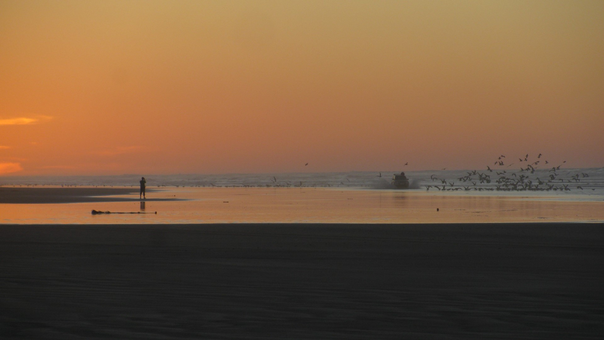 К обеду выехали к песчаному берегу океана , в устье реки. Немного выше по реке ставим лагерь. После обеда бороздим пески лагуны и пляжа. В резко много рыбы и прочей живности, а так же птиц, которые охотятся на эту живность. Берег очень популярен, встретили много джиперов. Трое ребят из Франции ночевали возле нас. У них два джипа на 3х, у нас 2 на 10 человек. Красиво жить не запретишь))… Общий километраж – 60 км