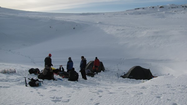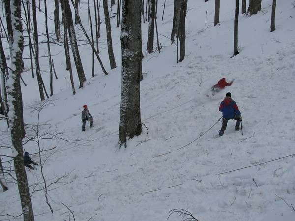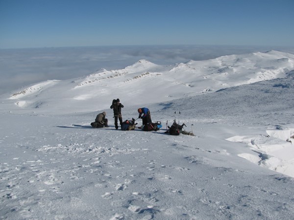Сбор всей группы состоялся 19 февраля в районе г. Сахарной Головка, Ангарский пер. Кто-то ехал из Одессы, кто-то из Винницы, кто-то из Киева. Лагерь поставили ниже перемычки у Сахарной головки в лесу. Дабы не терять драгоценное время на переход к месту тренировок ? Холодный Кулуар, то решили отработать основные технические моменты прямо на склонах возле лагеря. Хотя в кулуаре было бы интереснее ? снега больше и склон по круче.