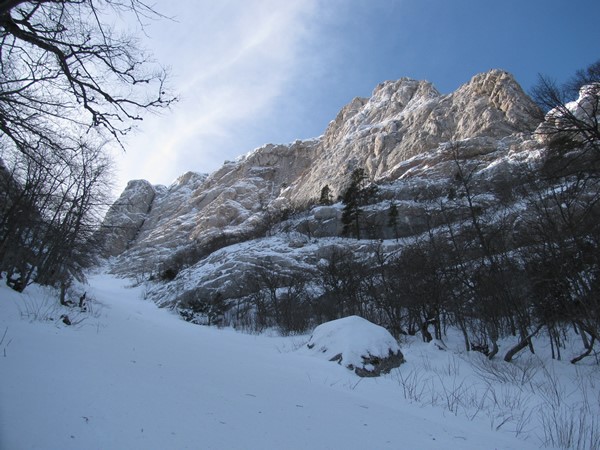 Второй день 20 февраля. Восхождение по Холодному Кулару и ночевка на верхнем плато Чатыр-Дага. Сегодня опять поймал себя на мысли, что: « все что делается, то делается к лучшему». На подходи к Кулуару пришлось тропить «по самое не хочу…». Пошли бы вчера на тренировку к кулуару потратили бы время на тропежку. Позаниматься нормально бы не удалось. В общем, часа через 1,5 мы пришли к основанию кулуара. Изрядно вспотев. Подъем по Кулуару оказался не намного проще, хотя снег оказался более плотным, чем в лесу, но все, же выматывало. Следов от предыдущих групп не было, следовательно, после выходных 12-13 февраля тут никто не ходил, да и видно лавинки посходили. Спасибо, появились туристы которые, «как нормальные люди» гуляют по лесу без рюкзаков и обогнав нас протропили нам и все идущим на верх.