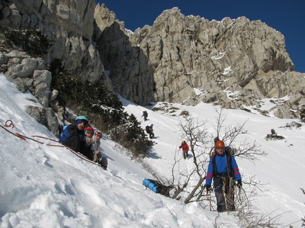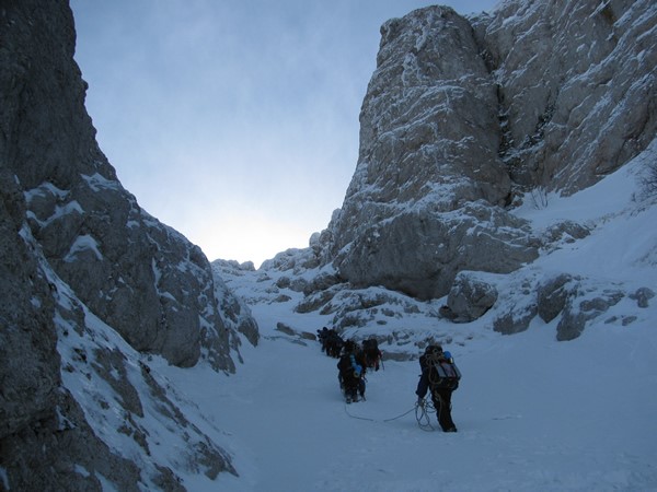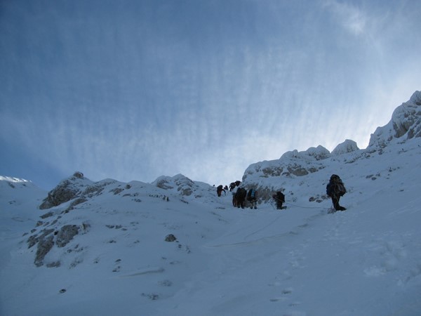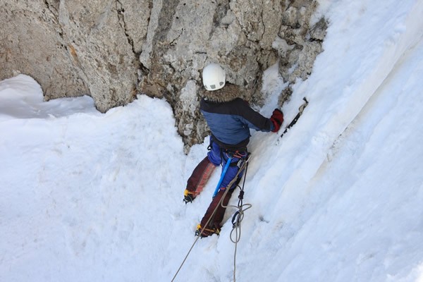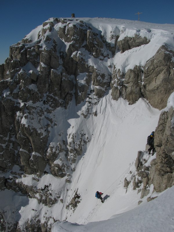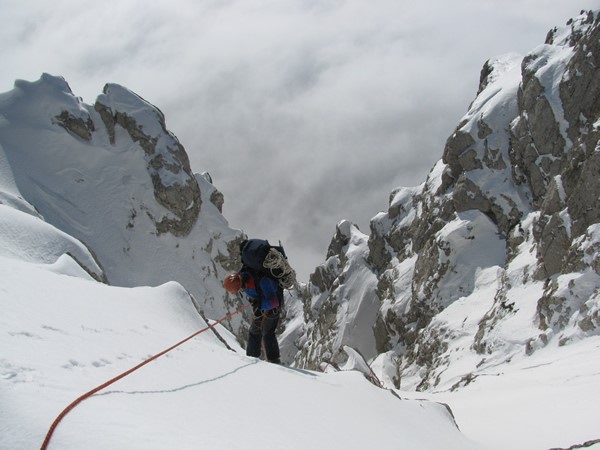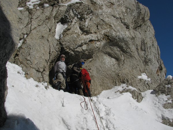 Еще 100 м по широкой заснеженной терассе до скального сброса, высотой 5 м. здесь 15 м по снежному склону с попеременной страховкой до скальной полки.