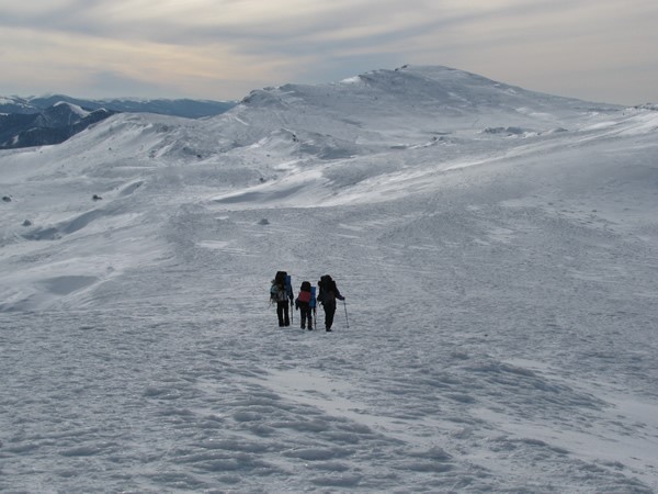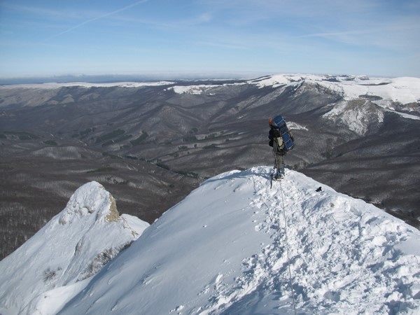 Очень много симферопольских ребят туристов, которые тоже тренировались, много обычных туристов. Встретили пару фрирайдеров. В общем, уходить с залитых солнцем склонов Ангар-Буруна не хотелось. Дальше наш путь к Эклизи-Бурун, где в одной из карстовых воронок мы планировали переночевать. Выйдя на верхнее плато чувствуешь себя участником полярной экспедиции, все покрыто снегом, а горизонт резко обрывается к морю.