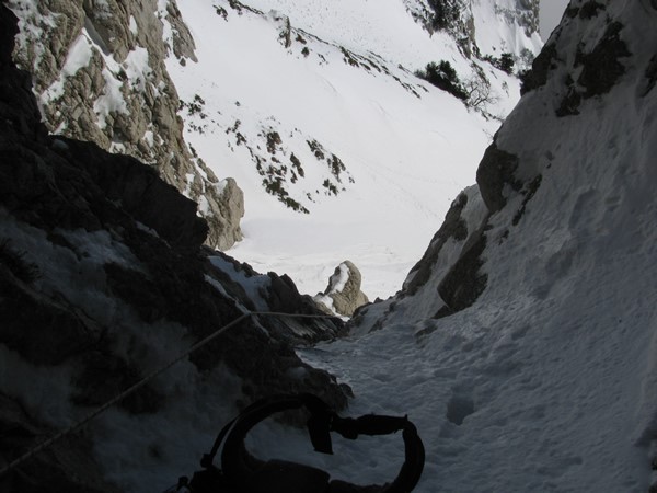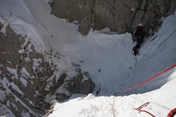 Еще одна веревка спуска 30-35 м до широкой снежной полки.