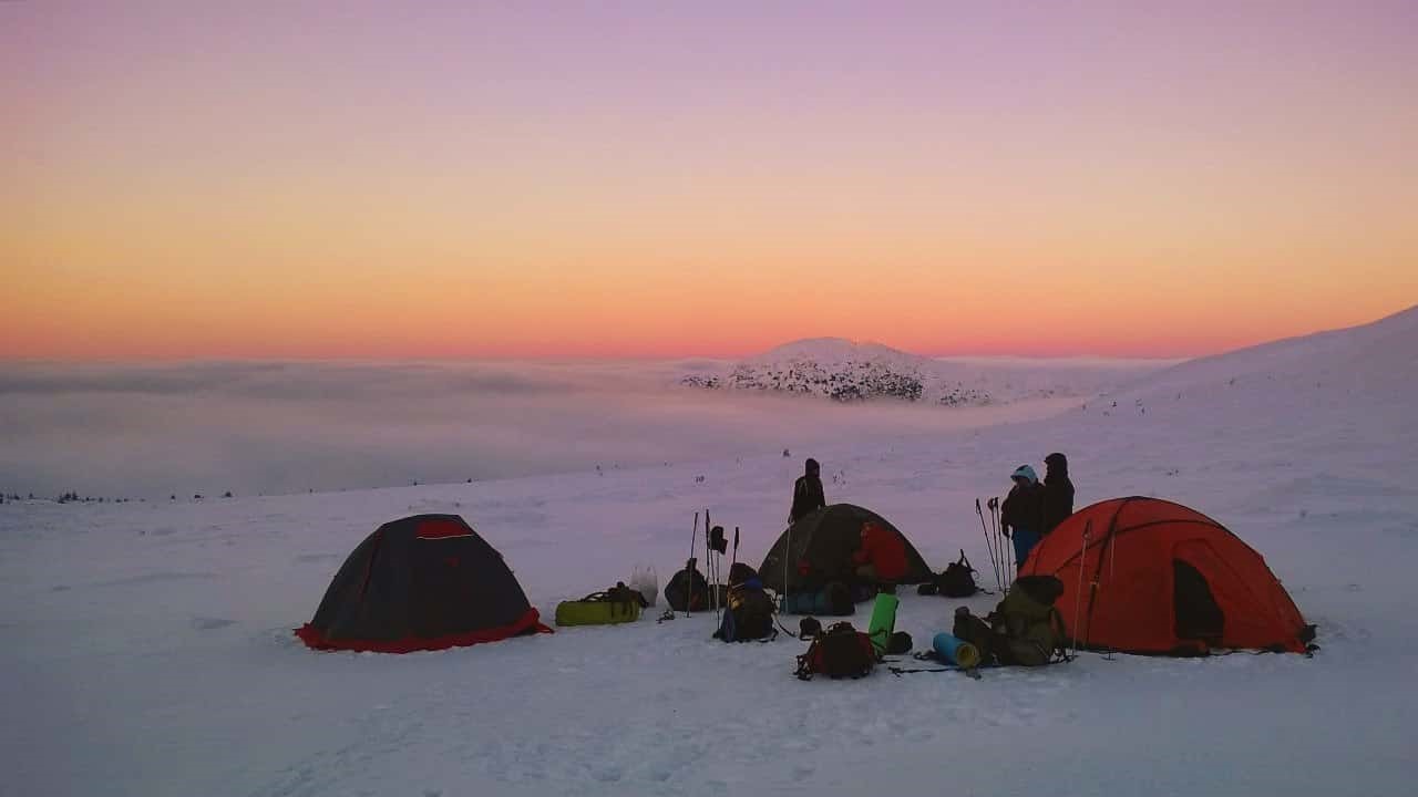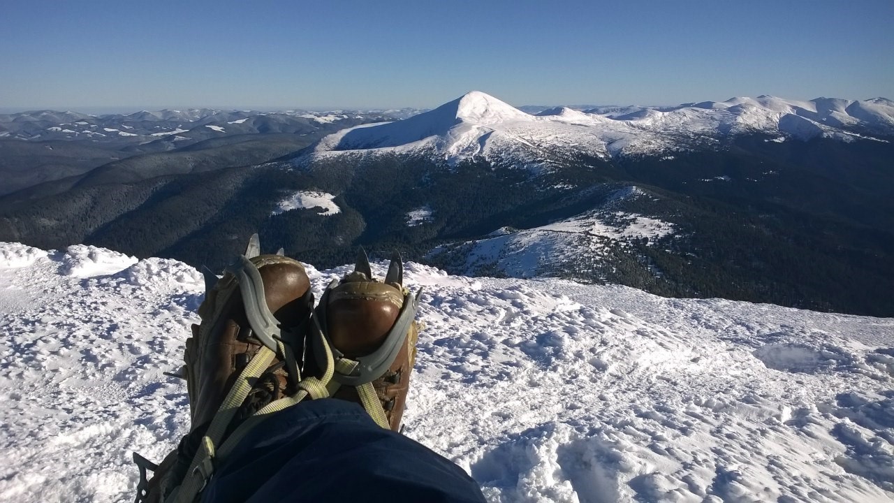 2.01 Утром засветло проснулись, покушали, и поперли с рюкзаками на Говерлу. Мороз крепчал. Покорили. Пофоткались, И пошли дольше. Погода супер. Виды вокруг – красота, снег промёрзший, изредка нога проваливалась до колена. Дойти успели до озера Несамовытого. Где и стали разбивать лагерь. Погода начала портиться, поднялись с долин облака и ветер. Чтобы скоротать холодный вечер без дров ходили кругами, прыгали бегали. С горем пополам переночевали, спину я утеплил.