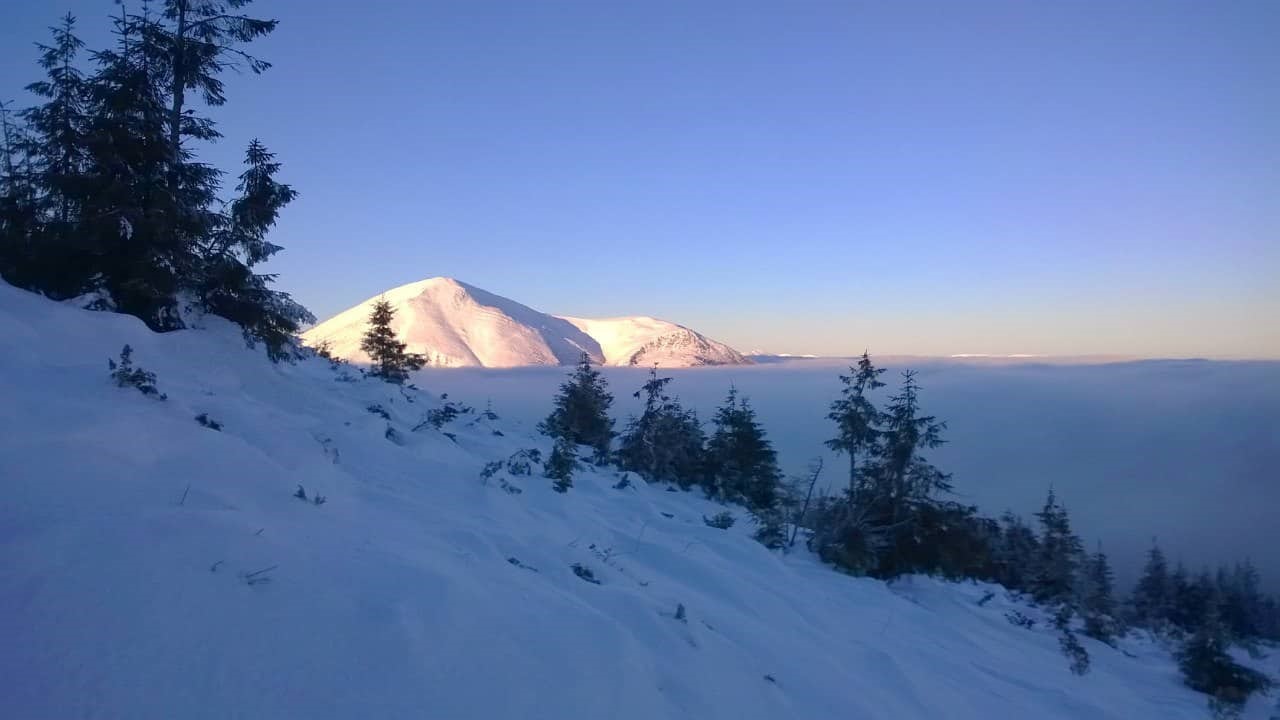 1 января выспались больше. Топили не так сильно. Был неприятный момент, заходит Наташа, вся в слезах. Говорит поскользнулась и сильно упала на копчик, что хрустнуло и аж в голову дало. Промелькнула мысль что поход может сорваться. Но все обошлось. Помогли разгрузить ей рюкзак, собрали свои и пошли в сторону Говерлы. На границе леса с видом на Говерлу стали на ночевку. Насобирали дров, поставили палатки. Кострище разделили с другой группой туристов, часть которых вернулась ночью с Петроса когда мы уже спали. За костром мы познакомились еще сильнее, каждый кратко рассказал о себе. И звезды еще были так близки. И вот первая ночевка на 20градусном морозе. Спал я посредине палатки. Проснулся от того что у меня замерзла спина. Холод пробивал сквозь коврик и два спальника. Дальше крутился на боках. Не комфортно было дышать морозным воздухом, бедное мое горло.