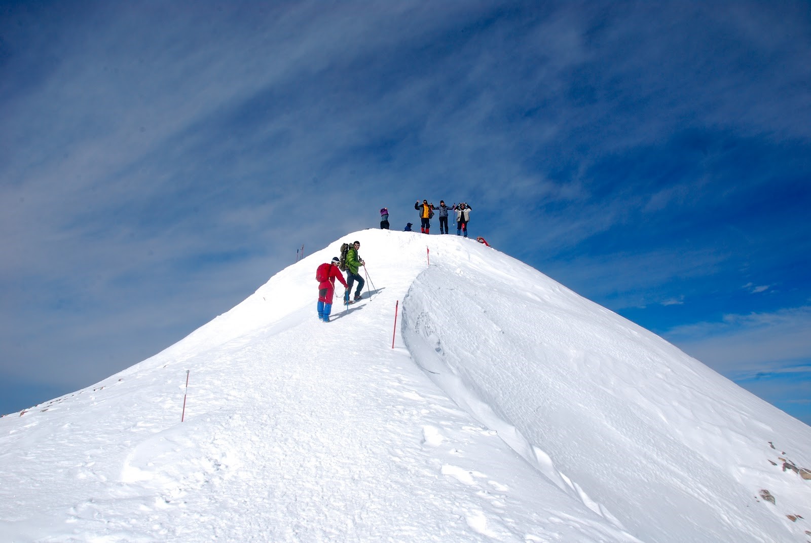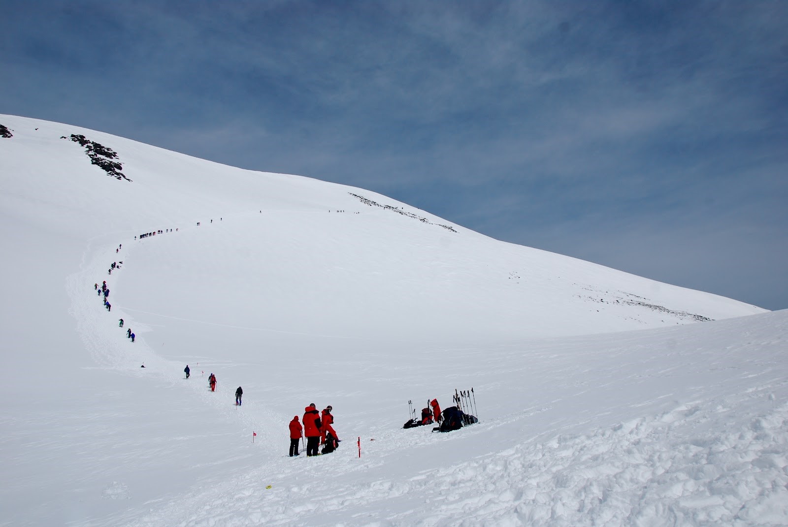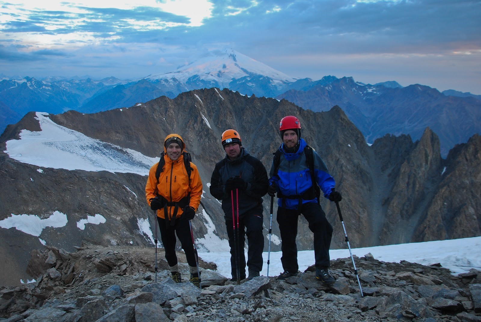 Ноги уносят нас от шума ретраков и запаха отработанной саляры. Ноги несут на нас мимо скал Пастухова и дальше по тягуну к Косой. Сознание ещё не до конца проснулось и не совсем понимает что происходит , но ноги знают своё дело и работают не сбавляя частоты. Луна на нашей стороне – светит так , что можно выключить фонарь. Ребята из моей группы держутся бодро , поэтому мы одни из первых в этой веренице паломников , пытающихся подняться на высшую точку Европы. Ночь меняется с днём. Середина лета , высота, 5000 м, – холодно. Одеваю пуховку и повыше поднимаю Бафф. Горизонталь косой полки. Перемычка. Осталось немного -ещё чуть-чуть напрячься, ещё один взлёт , цель уже ощутима и близка. Тело работает как чётко запрограммированный механизм. Оно совсем не обращает внимание на заторможенность сознания , дискомфорт вызванный короткой акклиматизацией ,холод и прочие мелочи. Оно идёт к цели. Вешка , за вешкой , шаг за шагом, вдох -выдох, вдох-выдох.