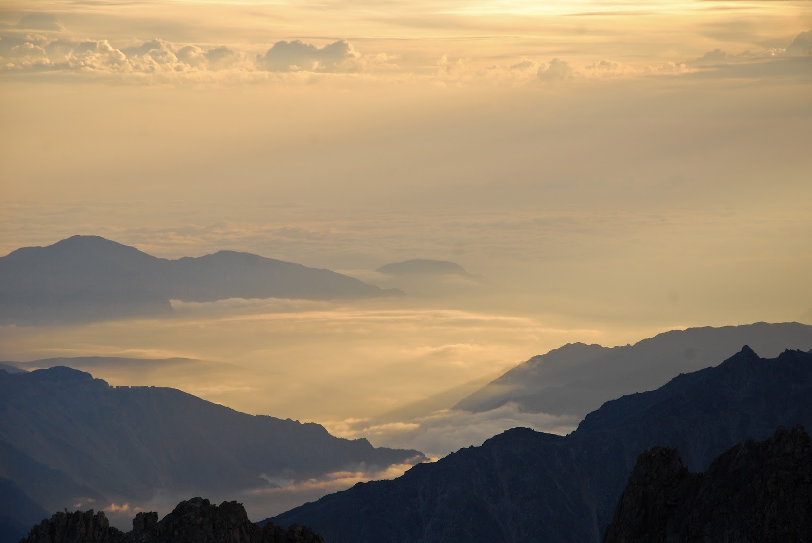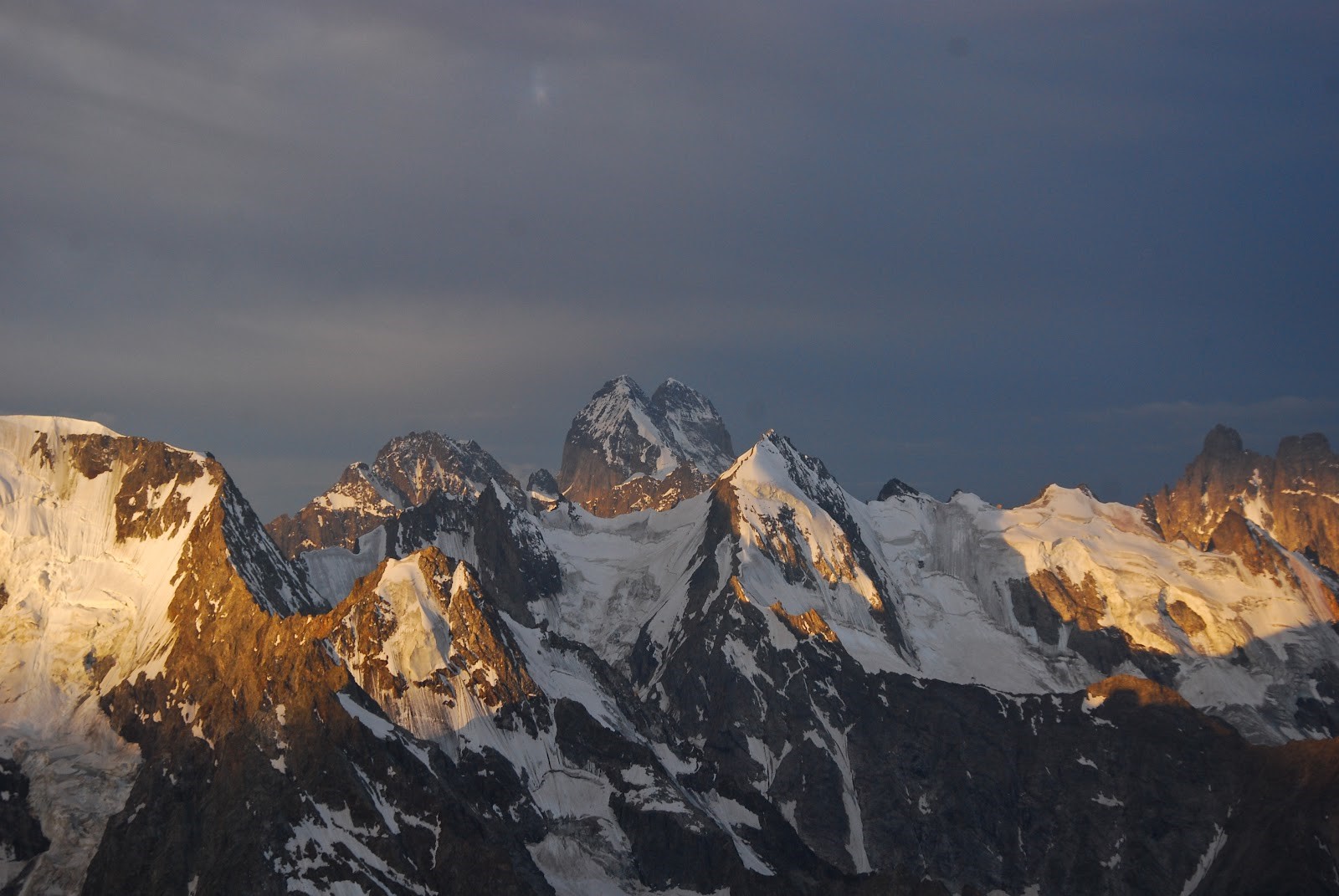 Панорама Главного Кавказского хребта ошеломляет , заставляя широко открыв глаза застыть в почтении к величию и красоте открывшейся картины . Рассветные краски окрашивают Джантуган, Башкару, Улу-Кару ,Вольную Испанию, Шхельду, Ушбу и дальше , дальше , дальше уходят за горизонт. Что мне остаётся ? Благоговейный трепет перед простотой и чёткостью правильных линий ,гармонией вечности и первобытности этих гигантов .