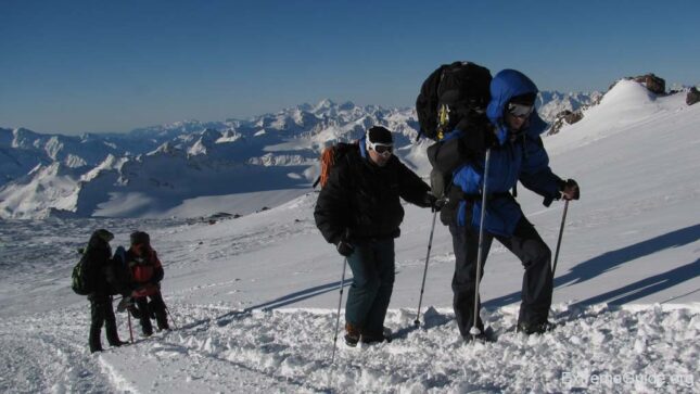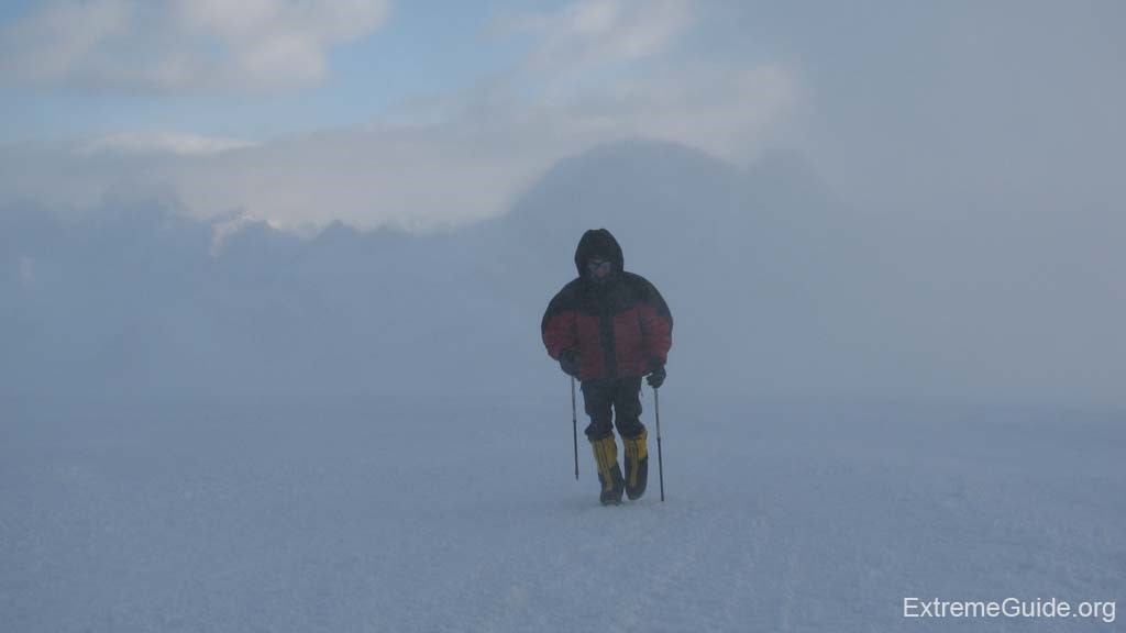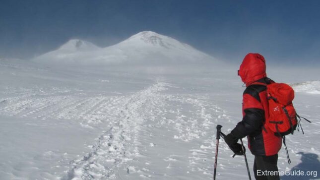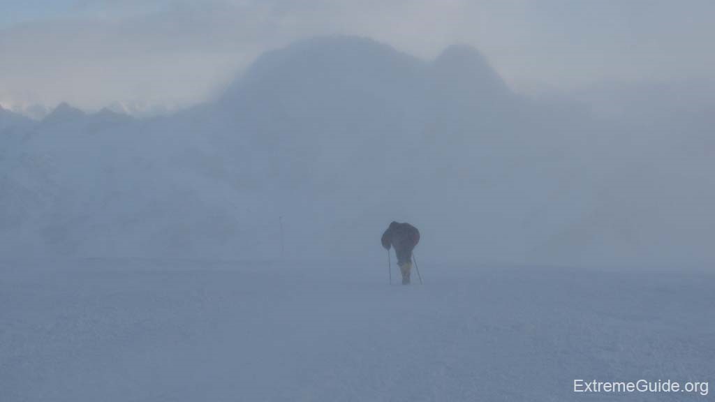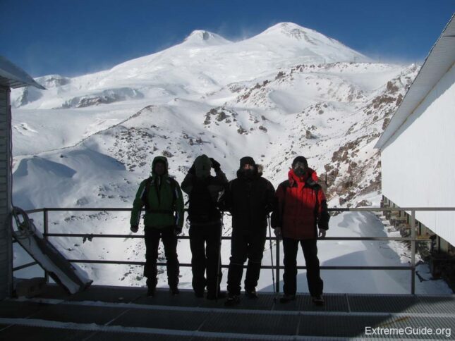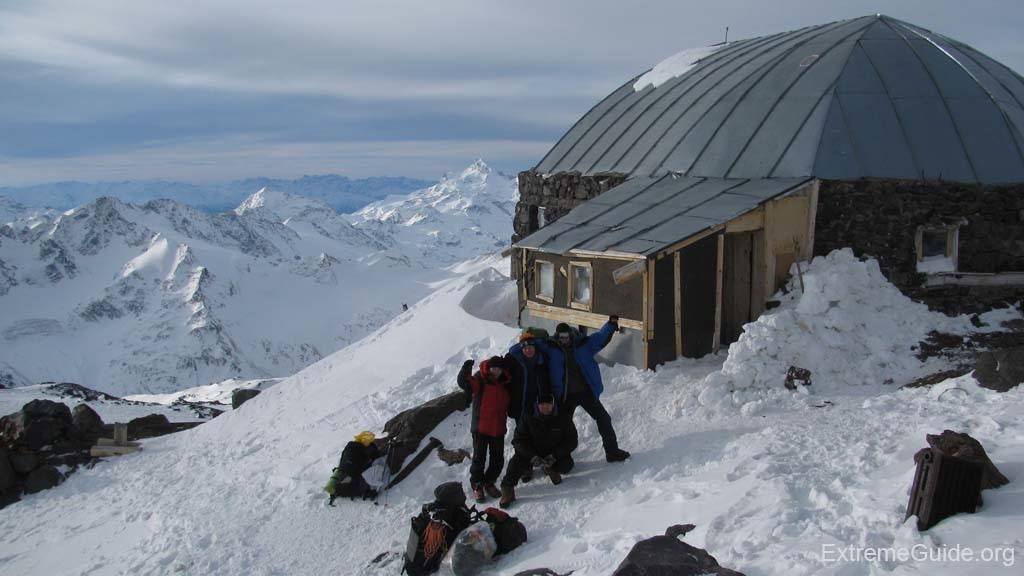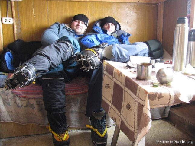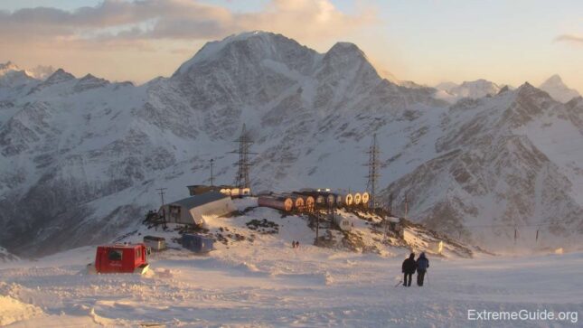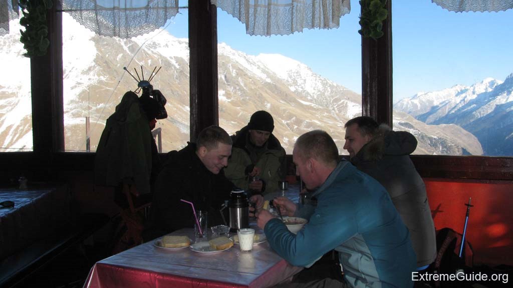 День 6.01. Отдых, Подъем позже обычно в 10:00. Состояние вялотекущее, ночью слегка подмерзли, но не критично, так как газовую плитку на ночь выключили, на всякий случай, чтобы не задохнуться угарным газом, так же мы поступали на «бочках», когда грели тем же способом свою комнату. Но «Бочки» сами по себе теплее и за ночь не так быстро остывали, как каменное здание «Дизель-хаты». Чтобы как-то разогнать кровь прошлись к «скалам спасателей», что напротив Приюта-11. После чего пришла идея сгонять на ратраке к станции «Мир» и там пообедать и вдохнуть кислорода на полные легкие, ну и вообще как-то наполнить красками томный день отдыха на Приюте-11. Попав на станцию «Мир», в нос ударяет большое количество запахов по сравнению со стерильностью Приюта-11: женские духи, шашлык, солярка. Попав в одну из кафешек мы заказали: хичины, солянку, лагман, шурпа и прочее. Через 2 часа вернулись на базу. Для дальнейшей подготовки к восхождению и сна. Решено было выходить 1:00, так как восхождение технически будет усложнено организацией перильной страховки на участке 500-600 м до выхода на «Косую полку» и потребует больше привычного ходового времени. Вечером мы узнали, что в этот день ребята из Краснодара сделали разведку боем и весь участок «зеркала» завешали перилами – 8 веревок, что гораздо упрощало задачи восходителей и повышало вероятность восхождения в этот день.