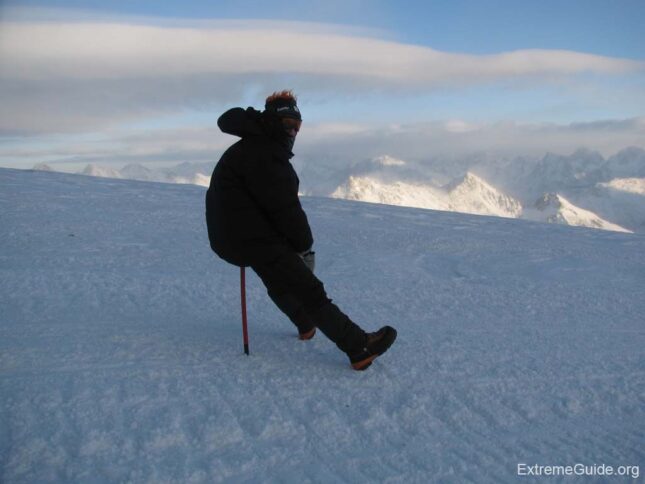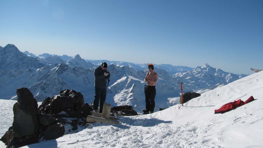 Не сильно рано состоялся подъем 31.12. В этот день у нас по плану акклиматизационное восхождение на г. Чегет до отметки 3400 м, ну и поиск места праздничной встречи Нового Года. Что касается самой встречи НГ, так у нас было три варианта с отметками высот над уровнем моря: приют «Бочки» – 3800 м, поляна Чегет и ее бары – 2000 м, пос. Нейтрино ( наш БЛ) – 1800 м. Первый вариант наиболее романтичный минимальным количеством с женщин (наличие которых очень важно в абсолютно мужских коллективах), людей, с яркими салютами в звездное небо на фоне Эльбруса, «…в присутствии чая в отсутствии водки…» и с минимальной акклиматизацией до этого (что чревато острыми головными болями и возможными «позывами к б…ре» по утру 1.01). Второй вариант – наиболее приемлемый, но банальный – с большим количество алкоголя, музыкой до утра, конкурсами и конечно представителями женского пола + Дед мороз и Снегурка. Третий – дома в на последнем этаже 9-этажного дома, рабочего поселка Приэлбрусья с оливье и селедкой у экрана голубого телевизора. В общем, в конечном итоге после недолгих раздумий мы выбрали второй вариант. Кроме того на Бочки после лета перестало поступать электричество, которое является источником не только света, но и тепла на этой высоте, а испытывать себя на предмет холода во второй день пребывания в горах никто не хотел. Третий вариант мы не рассматривали изначально. Подъем на г. Чегет в целях акклиматизации происходил по дороге и технической сложности не представляет. Дошли мы до отметки 2800, до известного кафе «Ай», где мы сели на обед с хичинами, лагманом и чаем из облепихи. Эльбрус нам открылся во всей красе, так как погода была более-менее ясная.