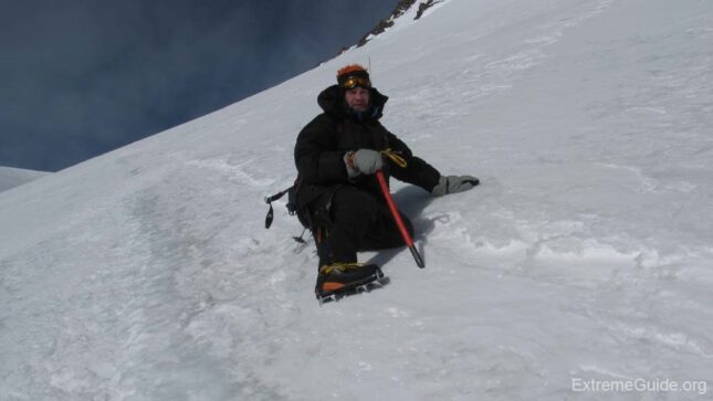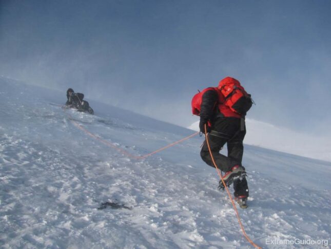 7.01. Практически не удалось поспать, сон пришел с 23:00 до 00:00. В 0:00 зазвенел будильник. Подъем, легкий завтрак овсянкой, сборы… Сборы затянулись и мы вышли в 2:15, вместо 1:00. Но это не так страшно. Медленно идем, впереди фонари еще одной группы восходителей из 3х человек наших друзей под руководством гида Сашы Школьникова и больше никого. В районе 3:00 зашумел ратрак на «бочках», который вывозил от туда народ до «скал Пастухова» ( на самом деле из-за льда он доехал до отметки 4400 м) Очень скоро ратрак поравнялся с нами и уехал выше гряды морены Приюта-11. Толпа фонарей горовосходителей на склоне, которых в этот день насобиралось около 30 человек. Идем вверх. Погода благоприятная, светит полная луна, температура -25…-30. Днем до -20. Идем очень медленно, чтобы не сбить дыхание. Участок от Приюта -11 до скал Пастухова всегда связан с борьбой за сон, и только к скалам твой организм окончательно просыпается. Догнали С. Школьникова. Поздоровались. Ребята которых закинули на ратраке стояли на метров 300-400 выше. Мы же в темноте искали провешенные вчера веревки. Идем на ощупь, вышли на веревки – стационарные перила с фиксацией в верхней и нижней точках. Принимаем решение двигаться по 2-3 человека с дистанцией 20 метров на скользящем карабине, но очень скоро понимаем что у всех разная техника и это может быть не безопасным (что кто-то может сорваться при движении вниз и поранить кошками товарищи при падении) в общем так чуть не произошло, когда все подошли к началу перил, чтобы стать на самостраховку: каким-то образом ребята: Славик, Леха и Саня запутались в ногах друг друга, упали и чуть не уронили Славу, который в тот момент был не на самострахе, а меня с Денисом просто дернули вниз по веревке в момент движения. Но все обошлось и решили больше не экспрементировать и идти как положено по одному человеку на веревке.