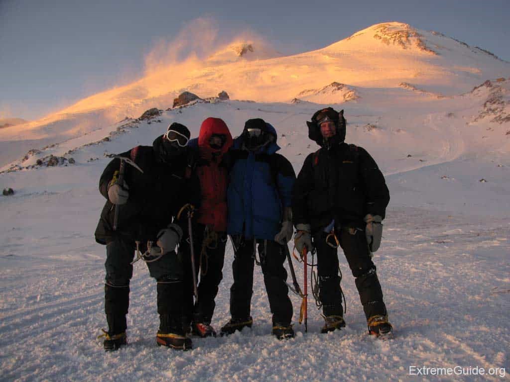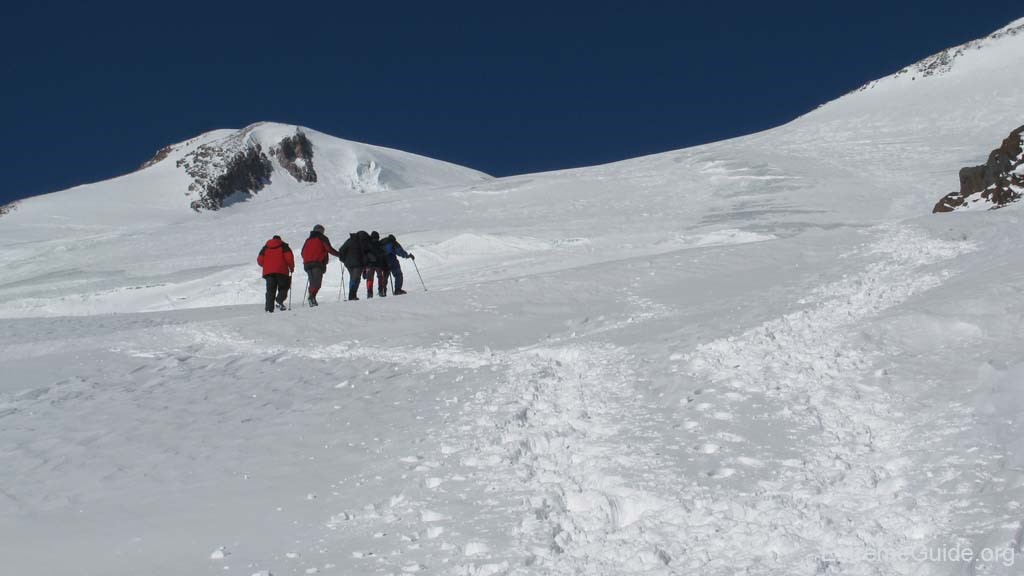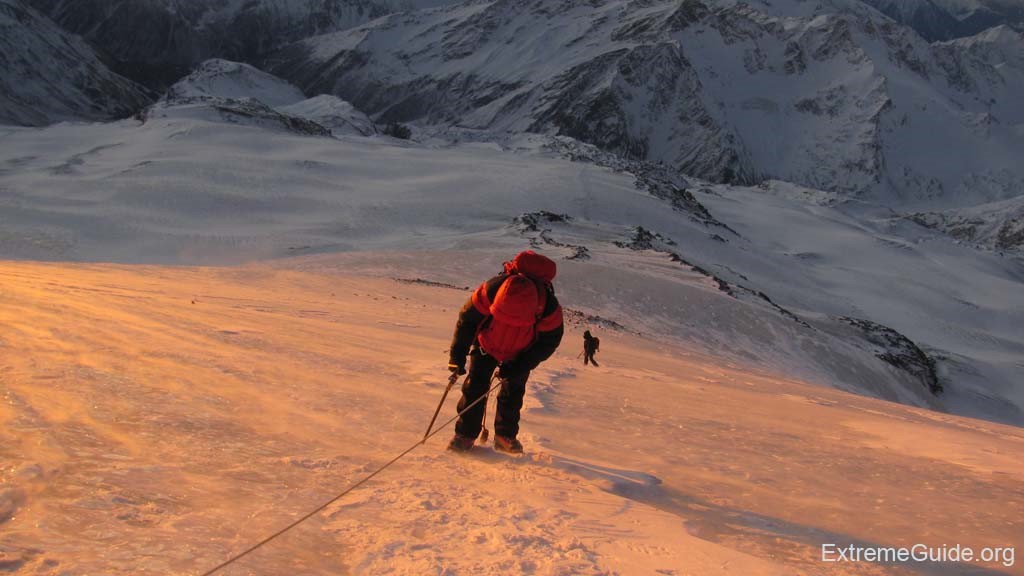 Момент восхождения от Скал Пастухова и выше всегда можно вспоминать как событие, которые происходили не с тобой, а в другой реальности. Команды, время ожидания на перилах, борьба с недостатком кислорода в легких, работа мозга замедляется, как и замедляется само время… Вот наступает рассвет, золотые лучи солнца взрывают горизонт. Все больше наступает понимание того что в этом году Эльбрус непредсказуемо сложен для новичков из-за такого количества открытого льда на крутой его части. Периодически вспоминаются слова народной альпинистской песни: ” Где Я, что Я? Мама забери меня от сюда…”Потихоньку высота и усталость закрадывается ко всей нашей команде, особенно к Сане, который двигаясь по перила выглядел явно уставшим. Денис из-за холода урвал вперед и прошел перила раньше всех, ждал нас уже на косой полке. После перил рельеф был более снежно-фирновый, но всеравно приходилось врубать кошки, а не ставить ногу как обычно при движении по снегу. Идем в связке. Сане предложил пока не поздно вернуться вниз, так как для этой высоты он сильно рано устал, но настоял на своем. Медленно и печально двигаемся далее… Саня занемог совсем и я принимаю решение пустить Дена, Леху и Славу вперед, а сам иду медленно с Сашей на верх, но очень скоро приходит понимание, что Саня до верха не доползет, а по темпу движения ребят и тому что многие, кто вышел ранее из-за сильной усталости и «горняшки» дойдя до седловины (5300 м) разворачиваются вниз и что это следует сделать пораньше и нам иначе рискуем по темноте спускаться вниз. Либо придется мне на своем горбу тащить всех 4-х. А состояние Саши было уже таким, что быстрым спуск не будет… Разворачиваемся вниз! Правда пришлось побегать еще за Лехой до седловины, он незаметно от всех оторвался вперед и дошел до седловины к контрольному времени, но состояние было такое, что если идти наверх к вершине, то сил на спуск не хватило бы. Как рассказывал Леха: «вижу зеленый снег перед глазами…». Догнала его высота…