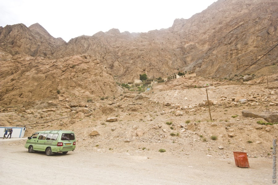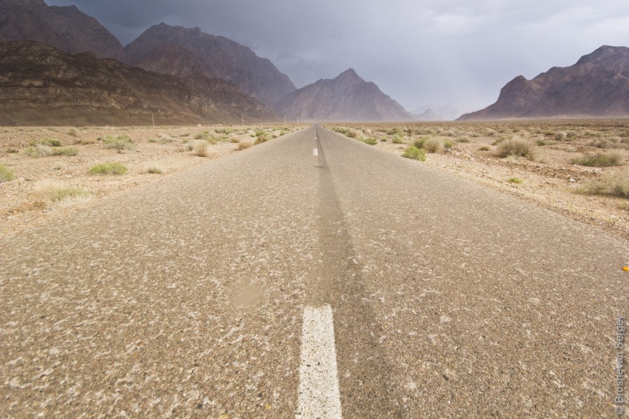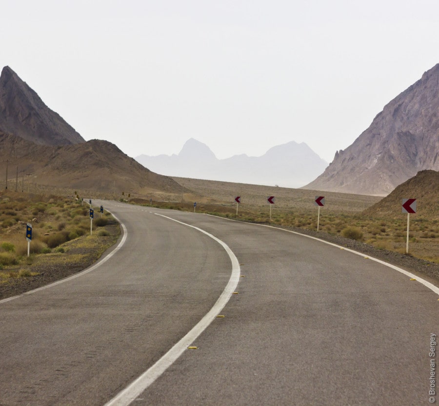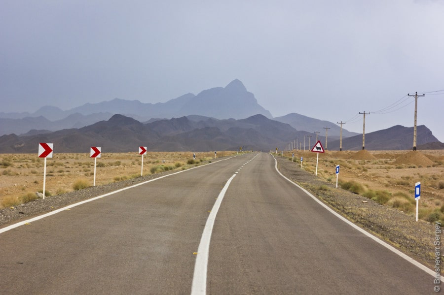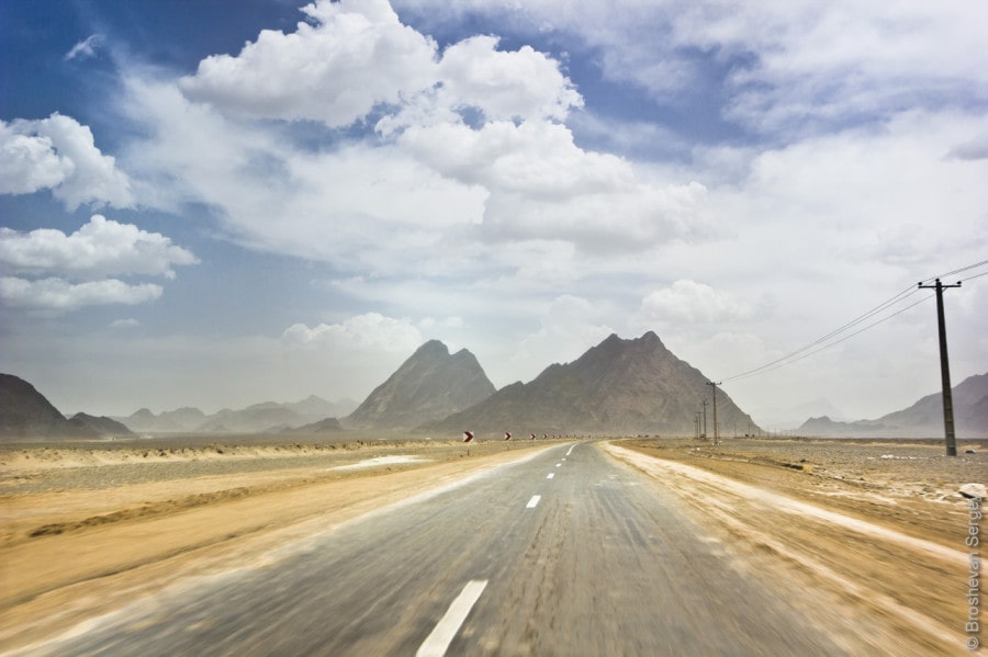 За вход полагается заплатить 50 тыс риал, но деньгопросное место спокойно обходится справа (как мы уже после выяснили, когда спускались). Однако ехать сюда, по моему мнению, обязательно стоит (главное в машине не спать). Дорога идет по потрясающим марсианским пейзажам, с выступающими из равнинной земли огромных гор, слегка петляя среди этих гигантов (хотя сама дорога идет по абсолютно ровной местности).