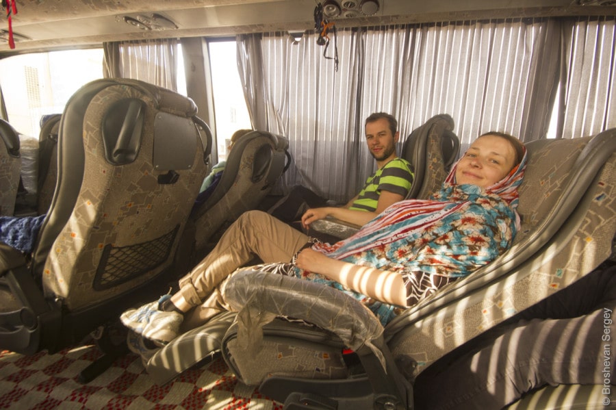 Следующим утром едем на автобусе в Исфахан. Есть такая забавная статейка в фотографиях, 19 причин, почему не стоит ехать в Иран. Я добавлю еще одну – убогие деревянные неудобные автобусы на убогих разбитых иранских дорогах:)