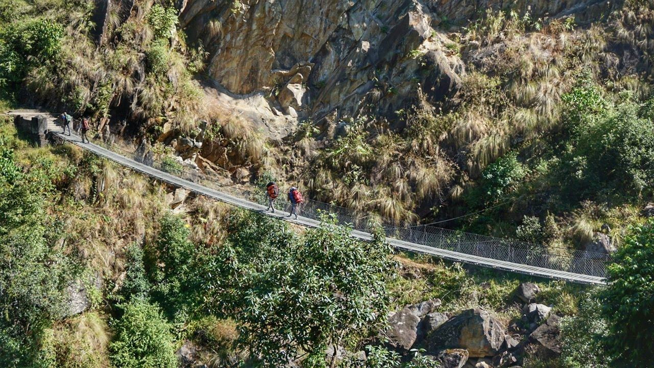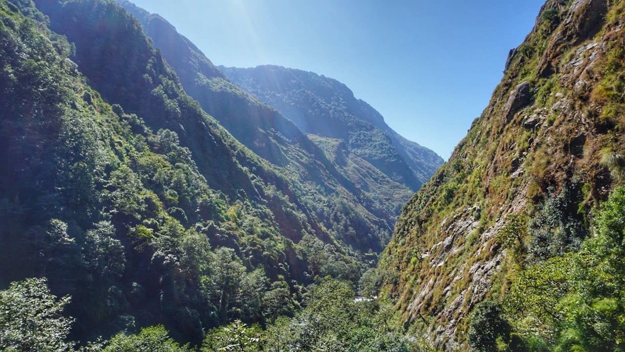 День 7. Идём в с. Пале. Тропа то вверх то вниз. Джунгли сменяются еловым и тисовым лесом. Вначале пути проходим красивые заросли бамбука, которые смыкают свод и образуют интересные алеи. Тропа идёт вдоль красивого каньона. Много водопадов. Иногда тропа выходит к реке. Габле обед. Вошли в зону проживания Шерпов. Несколько гест-хаусов. Далбад уже по 450. Дошли к 12:00. После обеда ещё 4 часа до Пале. Пару дворов. Есть лоджии. Далбад уже 500, внизу был 300.