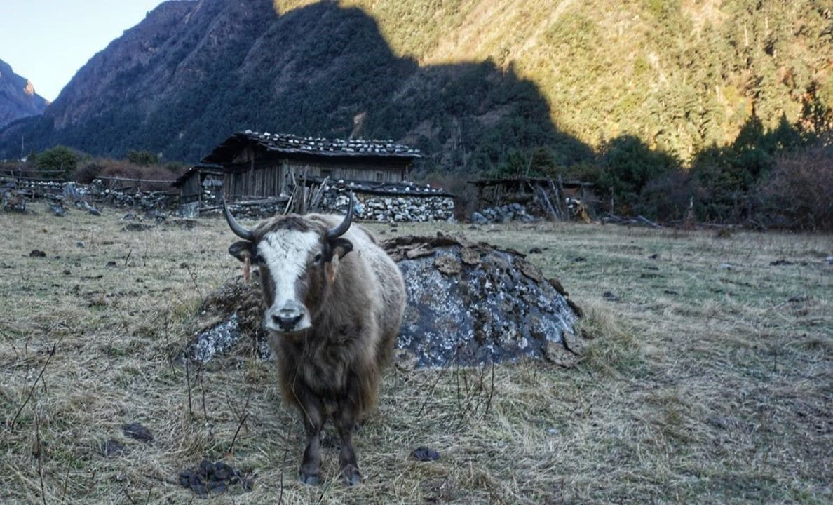 Перед началом села заброшенный поселок и много яков.