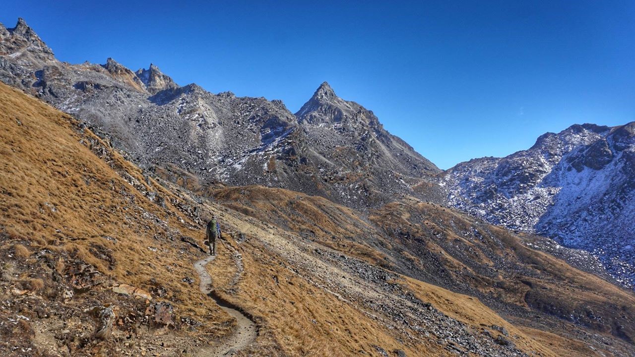 Переходим вдоль гребня и выход на следующий перевал Мингри Ла. Чуть ниже перевала поймали неустойчивый сигнал мобильной связи. Продолжаем идти вдоль гребня.