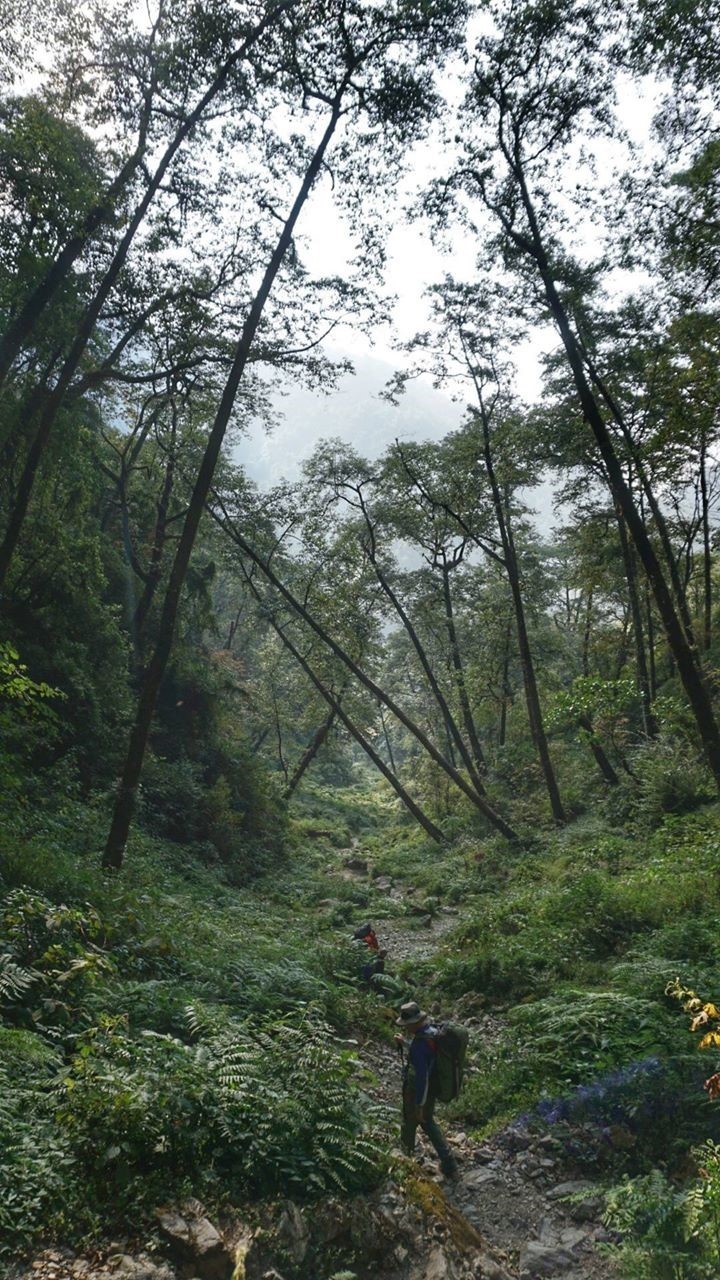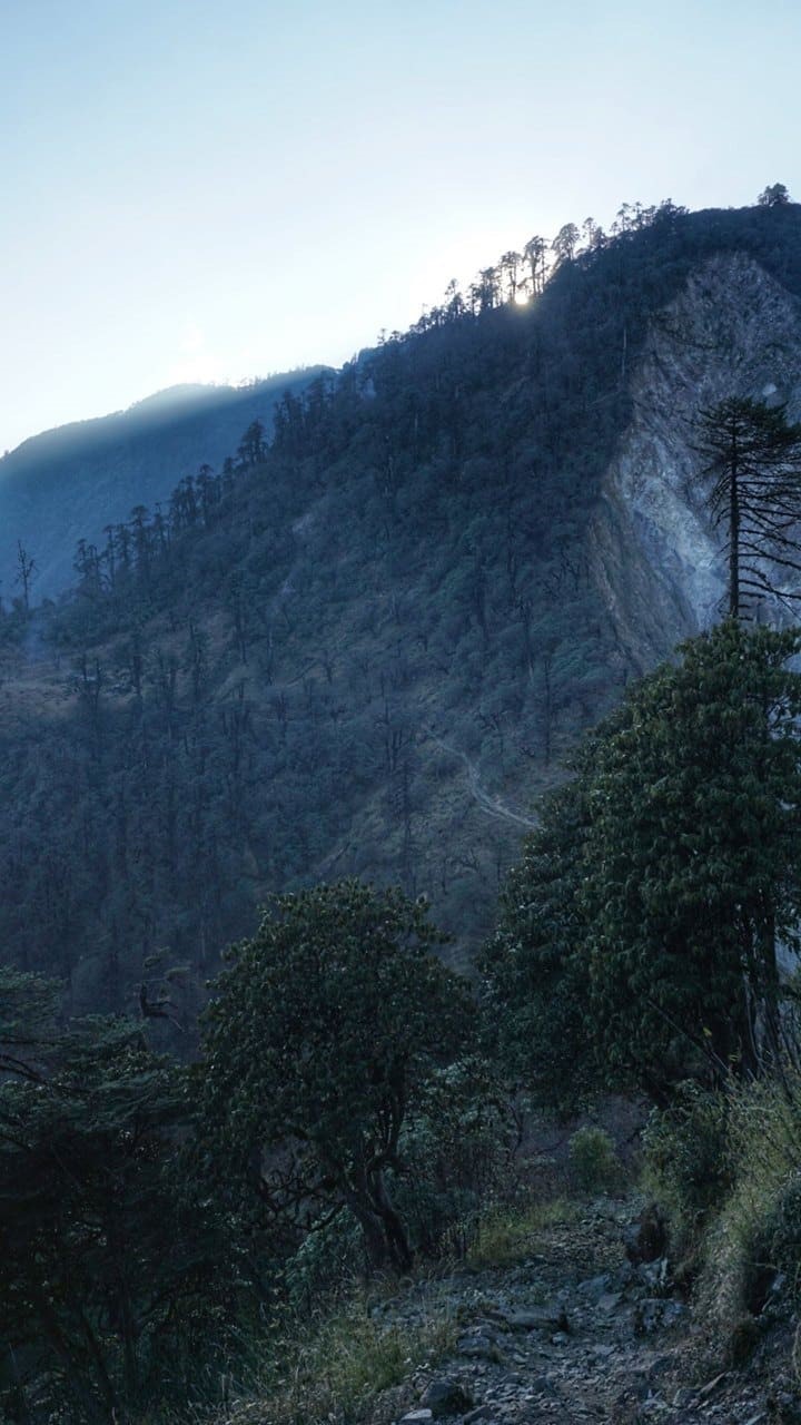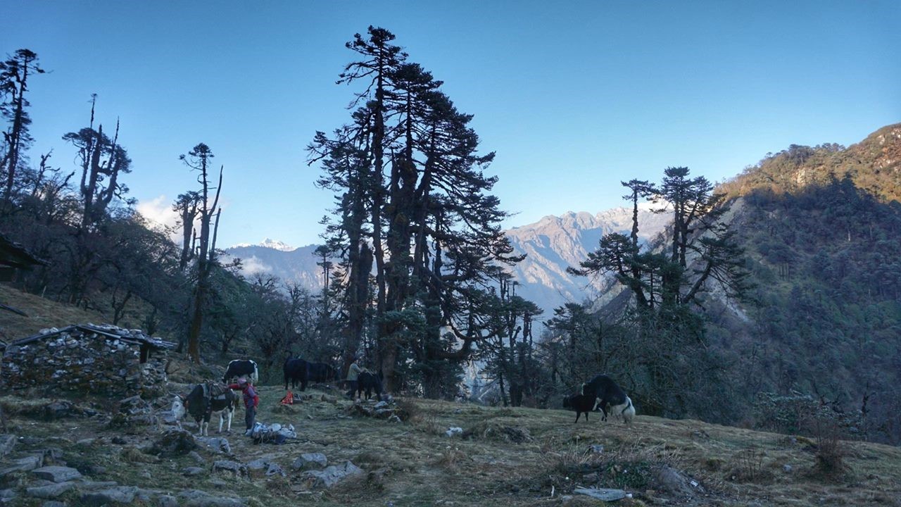 Обед в Тронгта, скинули высоту до 3100 м. Ущелье дикое и людей почти на тропе нет. После обеда набор высоты 500 метров к селению со сложным названием, шли три часа. Тропа идёт через тисовый лес и дальше через заросли рододендрона.