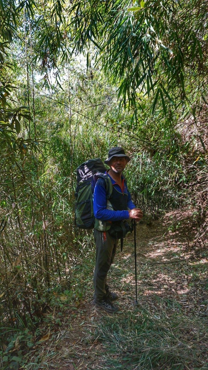 Часть спуска через заросли мелкого бамбука. Очень необычно, напомнило Маугли. Через час ходу тропа уходит с гребня в долину. За 2,5 часа скинули больше 1000 м в долину. Спустились к реке у небольшого водопада.