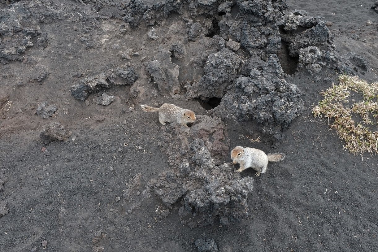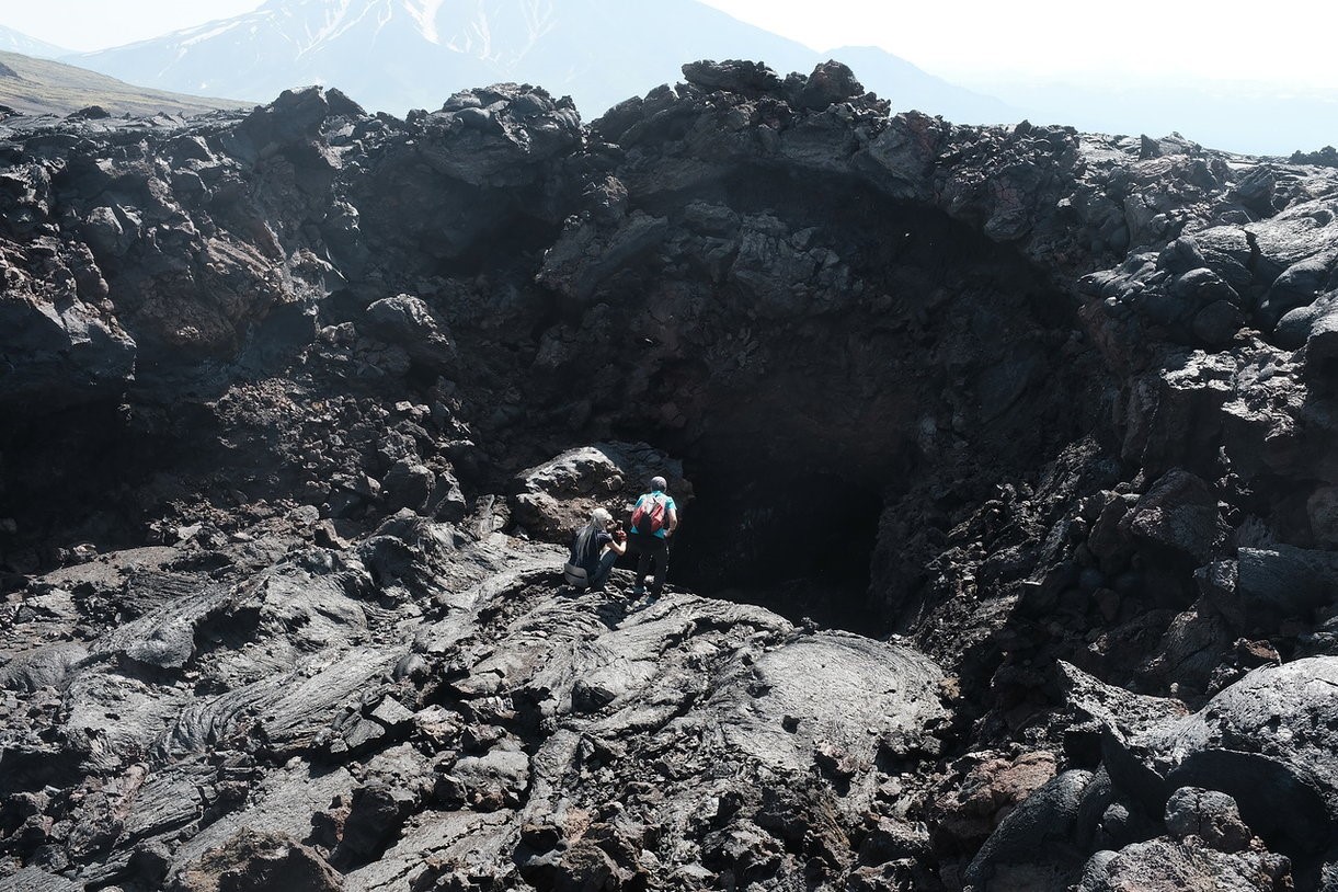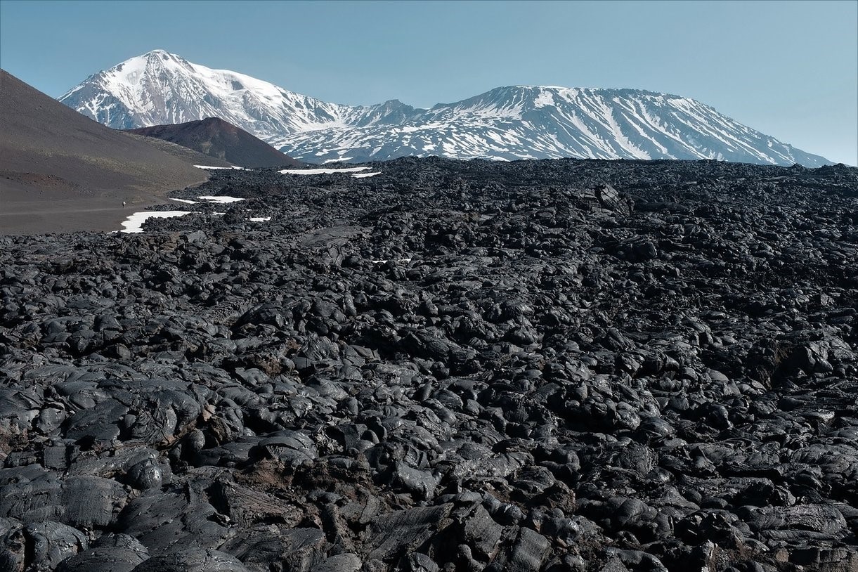 С учетом того, что я совсем не готовился к тому, что нас ждёт (не изучал заранее карты, маршруты, фотки и т.д.), увиденное очень будоражило! Практически бескрайние просторы выжженной земли с лавовыми и шлаковыми полями (результат извержения вул. Толбачик 1975 и 2012 годов) и вулканами Плоский и Острый Толбачики, Большая Удина на горизонте.