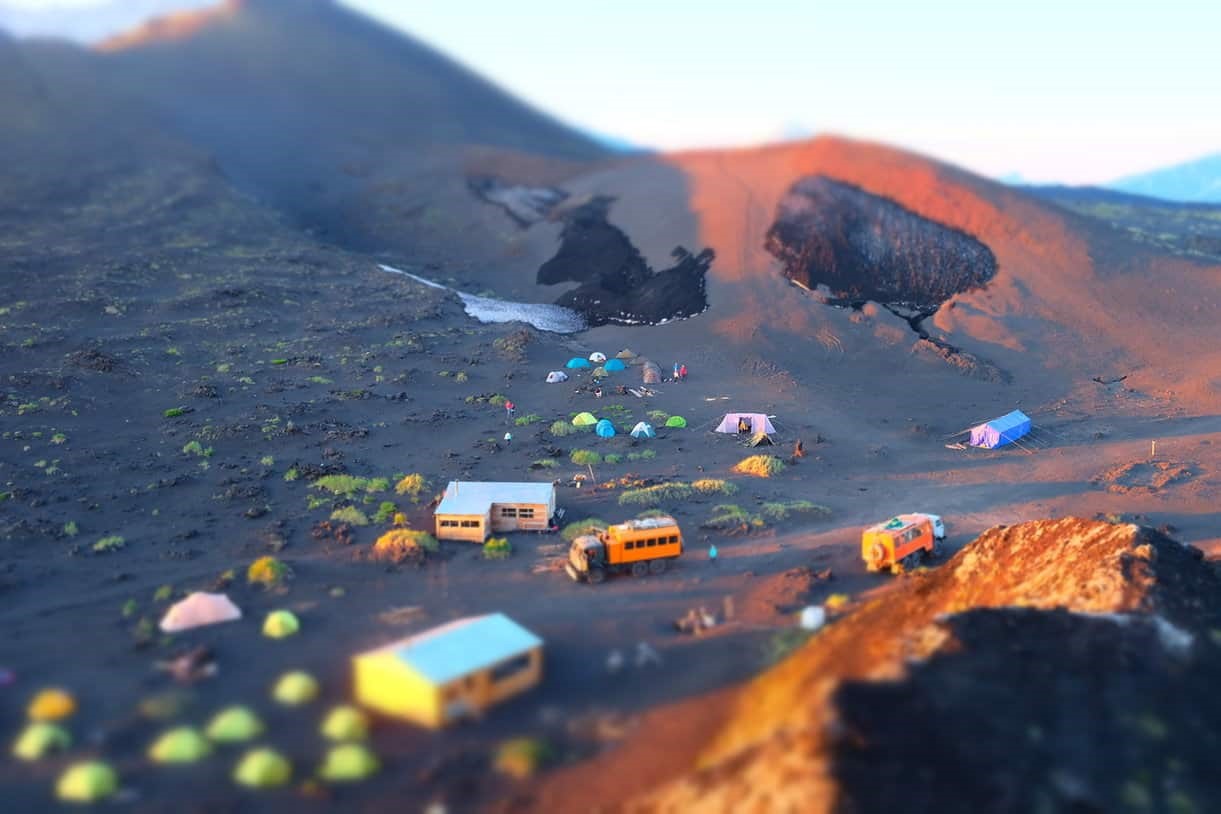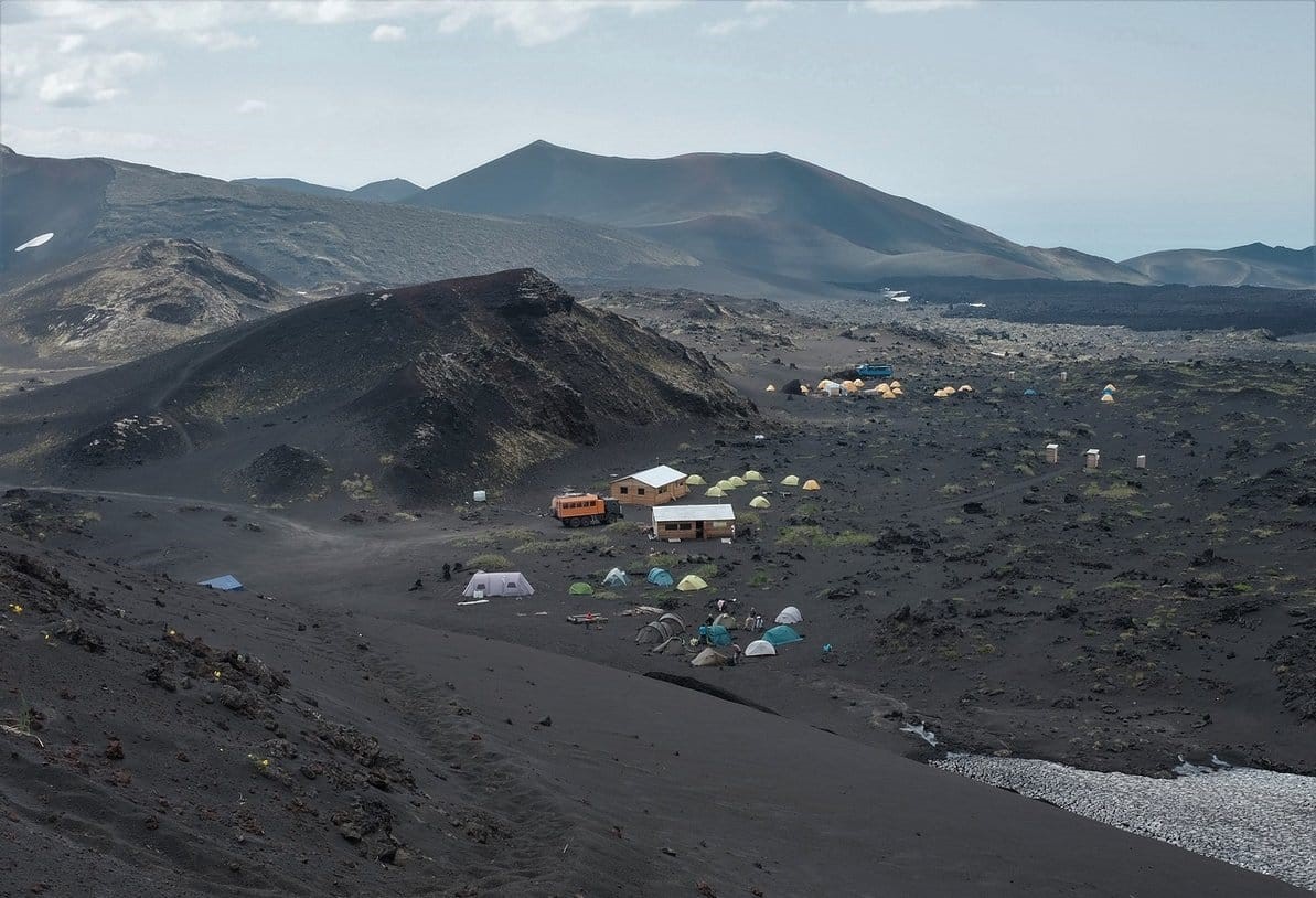 “Клешня” – это туристическая база с небольшой инфраструктурой (оборудованный родник с водой, несколько туалетов, а также кухней-столовой, которой мы не пользовались) в природном парке «Вулканы Камчатки». Лагерь используется туристами (как мы), вулканологами и прочими зоологами и ботаниками. Вокруг лагеря шлаковые поля и шлаковые сопки и в целом удивительный марсианский пейзаж.