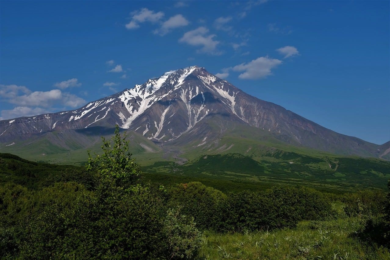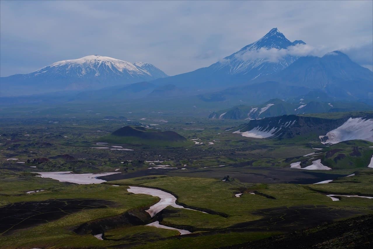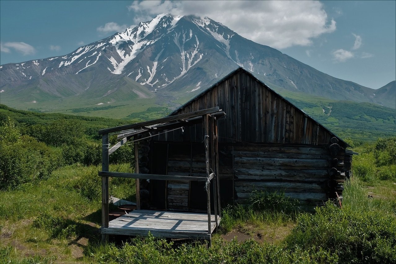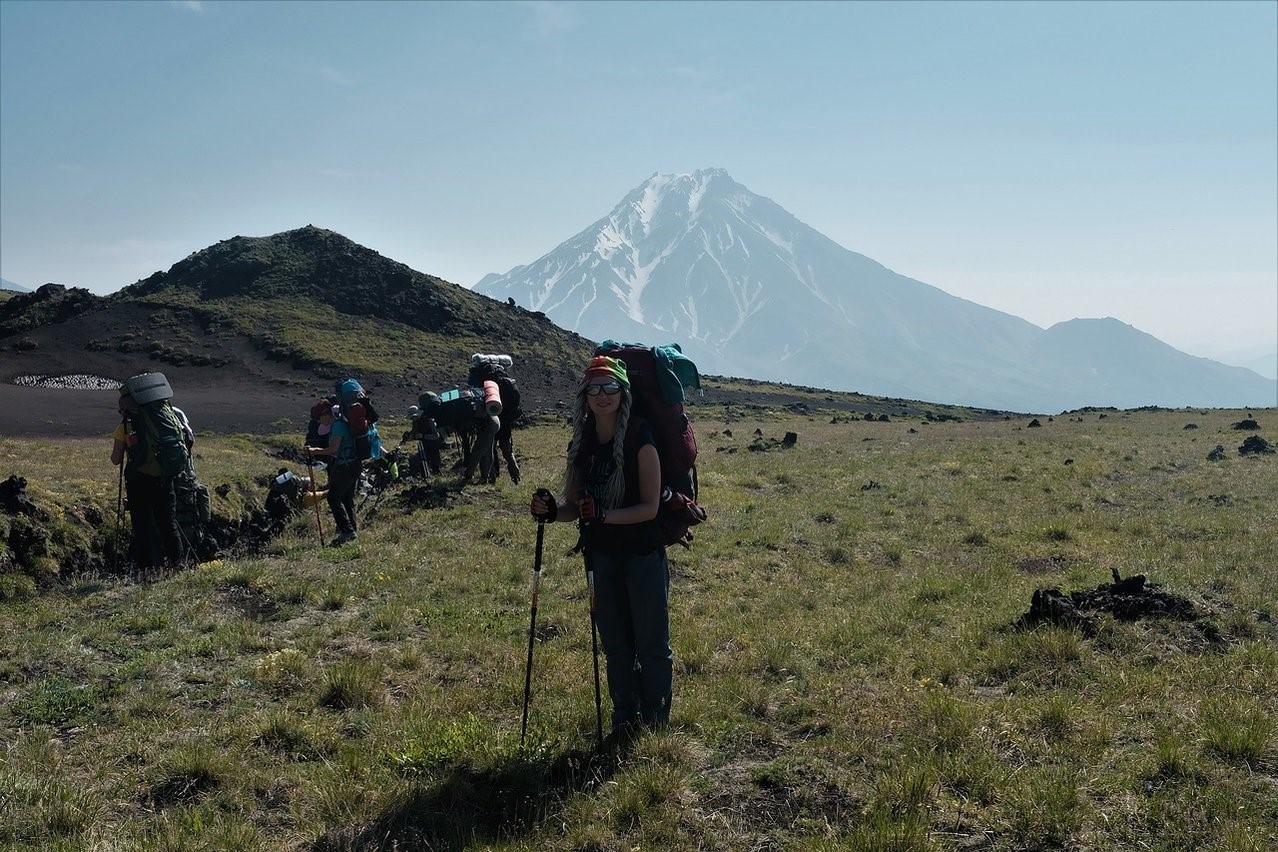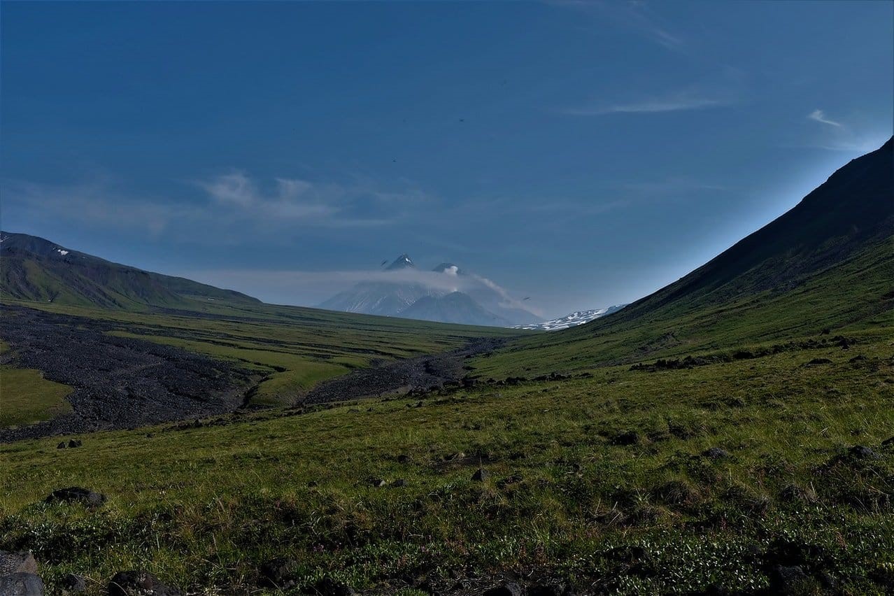 Наша цель пройти совсем небольшое расстояние (около 12км.) до стоянки под перевалом “Толуд”. Если повезет, мы сможем занять домик вулканологов и переночевать там. Постепенно окружающие пейзажи начинают меняться, и Камчатка становится похожей на ту, что я представлял – альпийские луга и на фоне величественные, заснеженные вулканы.