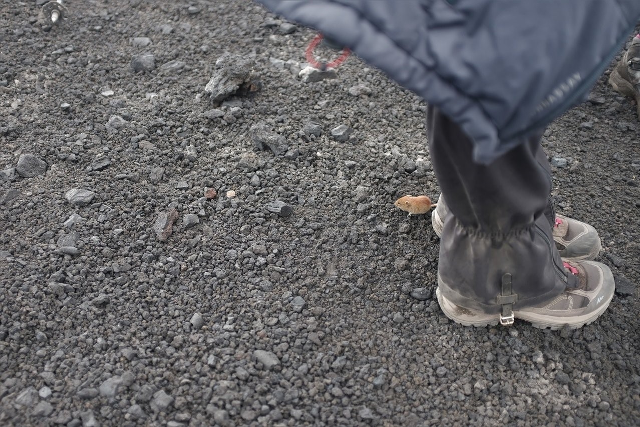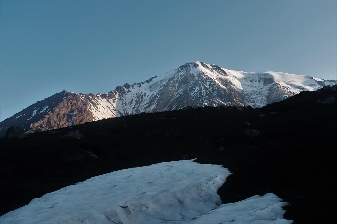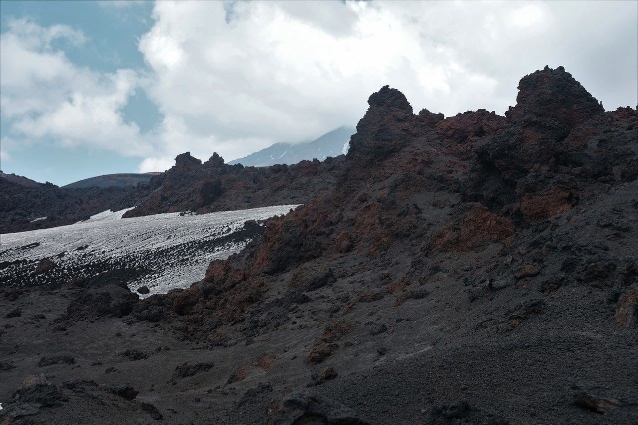 Быстрый завтрак, рюкзак на плечи (относительно лёгкий, с тёплыми вещами, термосом с чаем, общим перекусом на обед), палки в руки и вперед! Очень быстро оказываемся на вчерашних лавовых полях, по знакомому маршруту, а дальше постепенно лавовые и шлаковые поля сменяются снежниками.