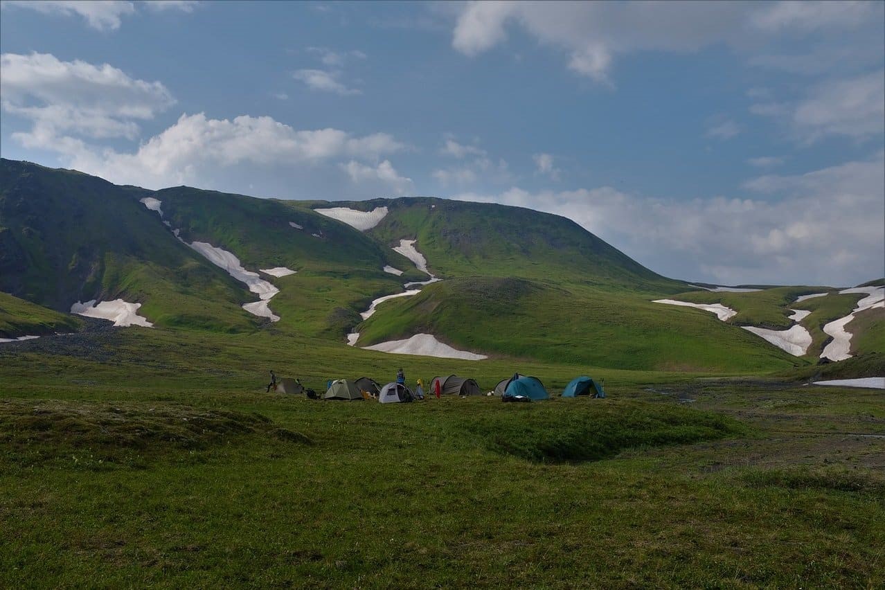 Выжидаем 10 минут и решаем обходить его стороной. Расходимся с ним, поглядывая друг на друга. Со знанием того, что тут медведь не так далеко от нашего предстоящего лагеря, спать ночью в палатке будет ммм… спокойно? 😉 Доходим до стоянки под перевалом Толбачинский, вот теперь тело ощущает усталость в каждой мышце, рюкзак кидать на плечи всё тяжелее и тяжелее. Место классное, ставим палатку так, чтоб при выходе был вид на вулкан (чтоб проснуться утром, открыть палату и ах! вот это вид! 😉 Мы с Наташей вызвались дежурить по кухне и всё бы хорошо… если бы не комариный ад!