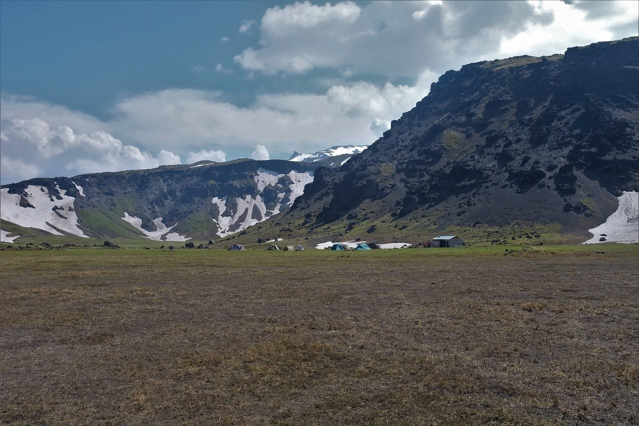 Спустя 2-3 км. мы дошли до нашей стоянки – “Марсово поле”, с шикарной беседкой. И тут впервые с Клешни нам встретились люди, вернее одинокая палатка с запиской “ушли на кратер”… ну ладно, ушли, так ушли, видимо, скоро вернутся. На самом деле балбесы-туристы специально повесили записку, мол они рядом, чтоб мы не залезали к ним в палатку и не копались в вещах…и в целом, вечером, когда они вернулись, показались несколько странными личностями.