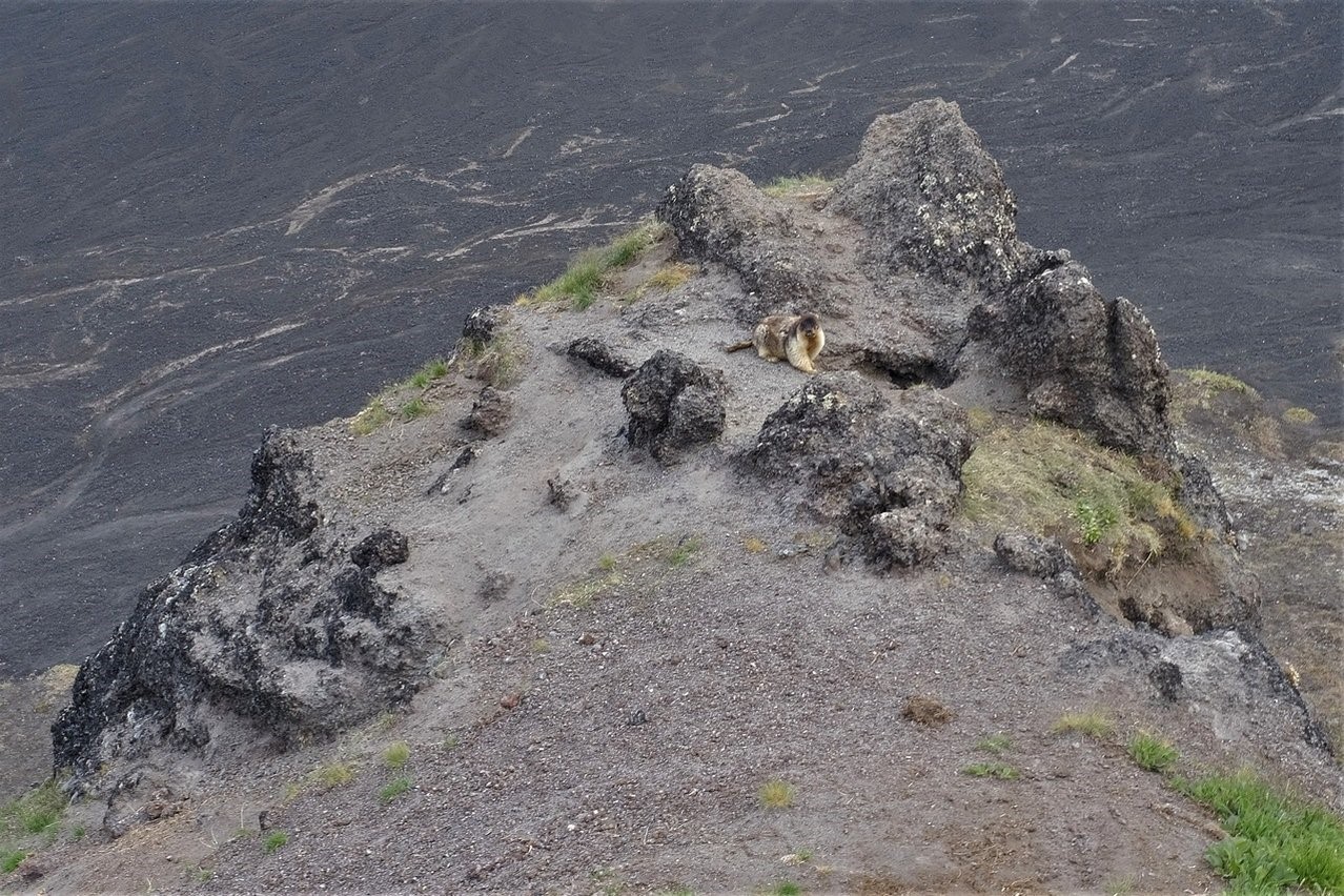 Сегодня предстоит не очень простой переход из-за постоянных спусков и подъемов. На подъеме замечаю на камнях какое-то животное, но долго не могу понять, это всё же зверь или такой причудливый камень, и когда убедил себя, что да, это камень…. камень повернул голову, посмотрел на меня и убежал =). Мы вступили на территорию новой живности – камчатского сурка (лат. Marmota camtschatica), он же “Тарбаган”, более пугливый, чем еврашки, но позировать для фото не отказывается.