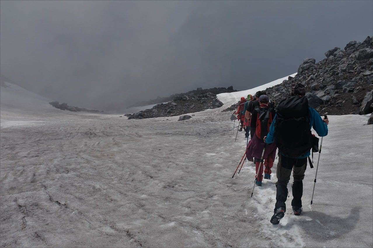 Спускались по крутому снежному склону, из-за опустившихся облаков и тумана казалось, что идём на край бездны и за видимым горизонтом будет отвесная стена вниз.
