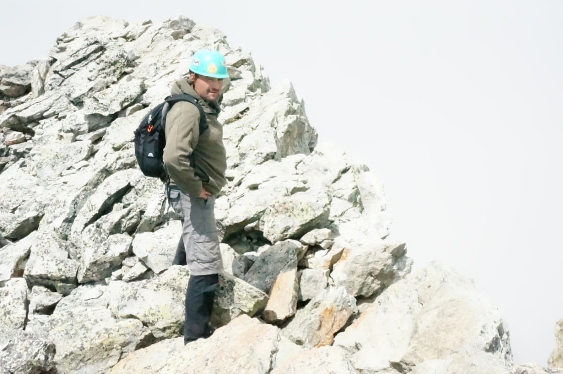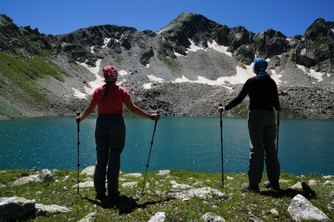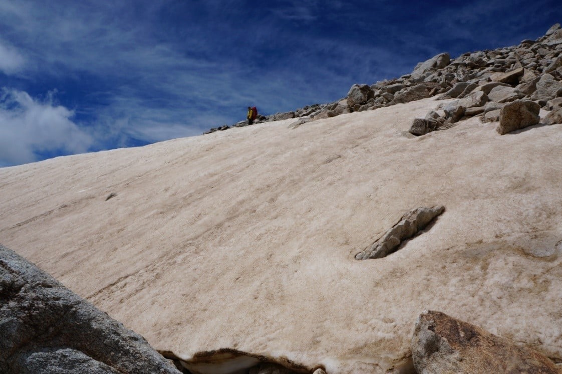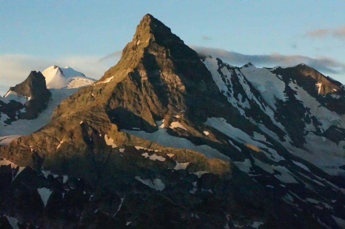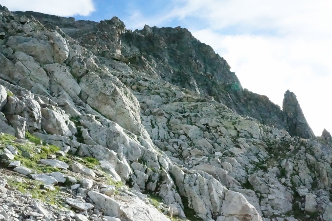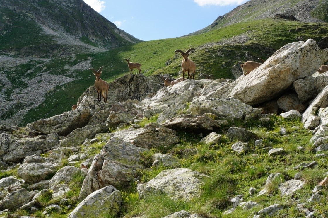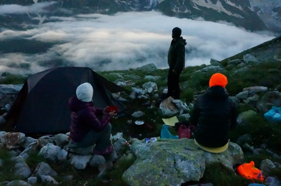 После обзорных площадок, уклон заметно уменьшается, но приходится идти без тропы, траверсируя травяной крутоватый склон и пересекая осыпи, что тоже непросто с полным рюкзаком под конец дня. Хотя эти осыпи заметно более комфортные, чем аналогичные на Алтае. В общем, переход в штурмовой лагерь забрал у участников много сил. И опять же, альтернативы я не вижу. Как бонус – виды с тропы замечательные, а уставшие мускулы помогают впечатлениям глубже проникнуть в подкорку и надёжно там зафиксироваться. В штурмовом лагере мы вновь встретили горных туров, но их было меньше и вели они себя гораздо застенчивей. Постукивали копытами по камням в радиусе 10 метров и прикольно пересвистывались между собой. На следующий день на штурм вершины вышли двое : гид Владимир и я.