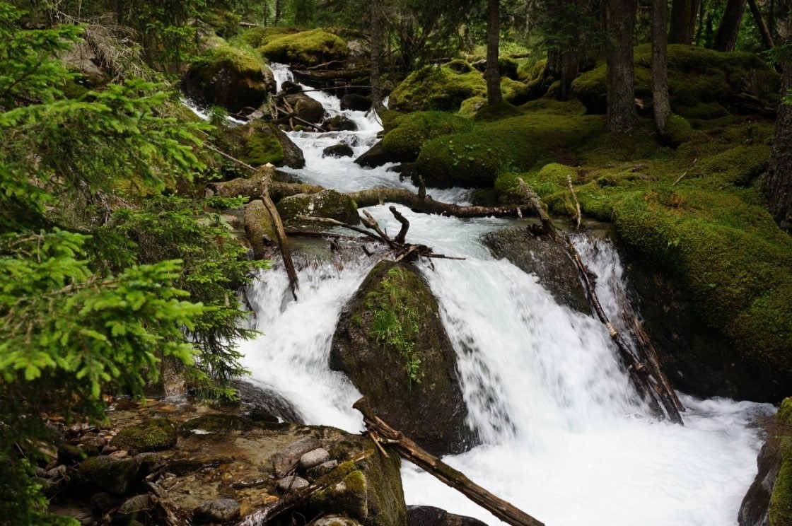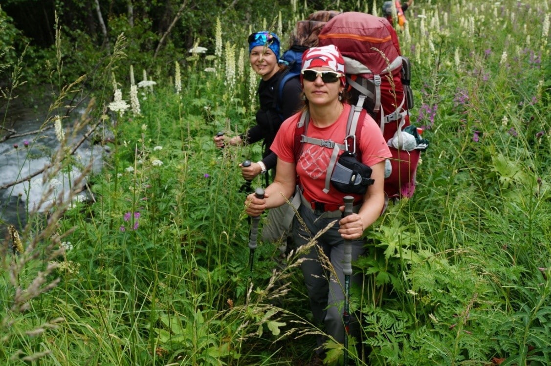Красиво, но аллергикам надо быть готовыми к воздействию пыльцы. Вот тут, небольшие дождики во время движения, сыграли положительную роль. После того, как тропа входит в лес, она становится заметно комфортнее. Вид высоких стволов с бородами зеленоватого мха на ветках, неширокой, но бурной реки Муруджу с изумительной, свежей, прозрачно-голубой водой, с берегами из камней, покрытых густым изумрудным мхом, небольшими водопадами и упавшими деревьями в русле, вызывает в памяти картины Васнецова на темы русских сказок.