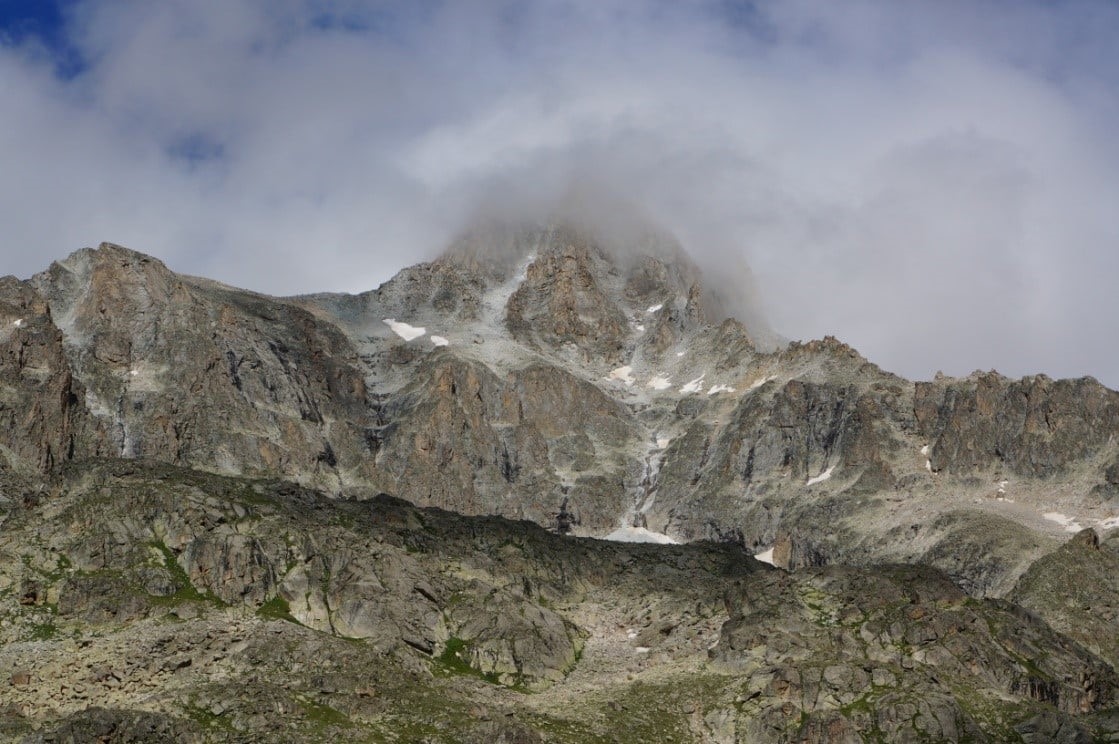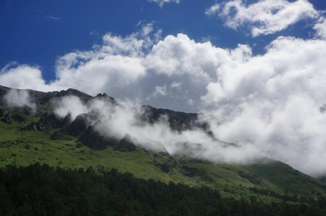Девушки решили подождать нас в лагере. Восхождение проходило при переменной погоде, периодически на нас наплывало облако.