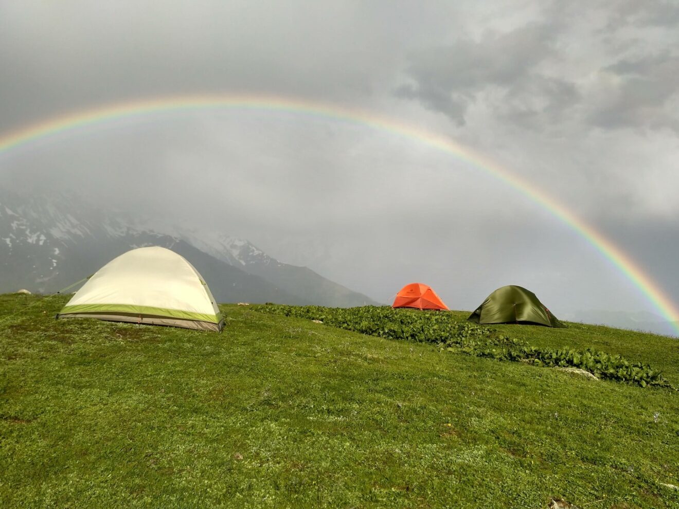 Как правило, все приезжающие в Местию туристы поднимаются к Кресту и даже дальше, к озерам. По крутой лесной тропинке или по пологой, но длинной дороге. Обычно налегке, за один день — туда и обратно. Мы тоже поднялись, на второй же день по приезду. Но с рюкзаками, с палатками, с ночевкой. И именно утром, на рассвете, были вознаграждены прекрасным видом двурогой Красавицы. Но лично на меня, пожалуй, еще большее впечатление произвела открывшаяся нам круговая панорама. Со всех сторон, огромным серебряным кольцом стояли горы, окаймляя зелень долин и ущелий, извилистые нитки рек и ручьев, вся Сванетия лежала вокруг нас. Уже ради одного этого стоило приехать сюда и подняться на этот крутой холм.