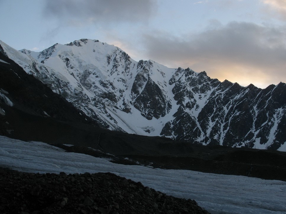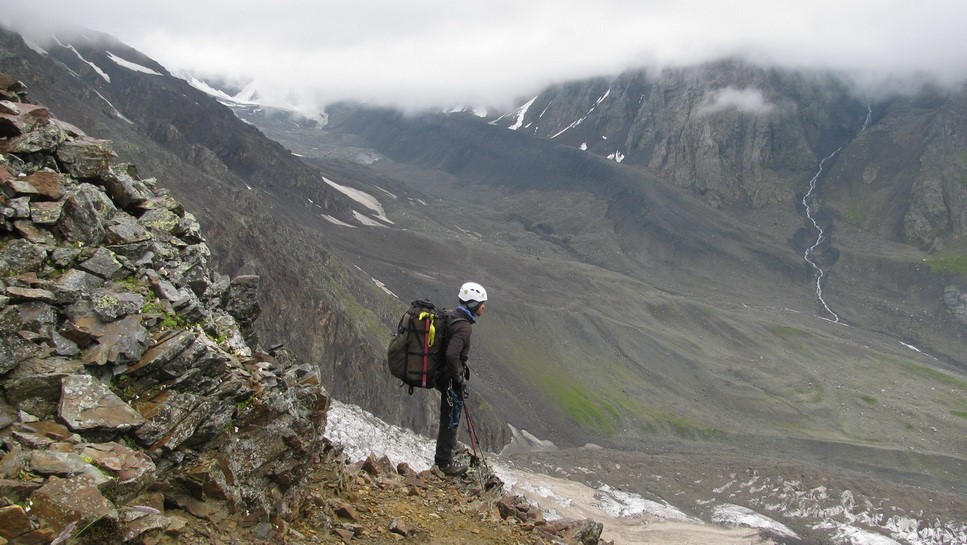 Подъем на п. ОЖД начинается с ледника Майли на уровне 2700-2800 м, по разрушенным скалам, местами в начале нужна перильная страховка, но не обязательно. Тропа извиваясь идет вверх. За три часа достигаем стоянок «У креста» – 3450 м. Очень уютное место с множеством площадок под палатки и ручьем с водой. После обеда решили радиально прогуляться на высоту 3900-4000. Так и сделали. Выше 3500 на горе много снега. В кулуарах следы от лавин. Подъем больше по скалам контрфорса п. ОДЖ, дабы не тропить по раскисшему снегу. На спуске Костя задал вопрос по поводу лавинной опасности склонов, на что я ответил, что лавины уже маловероятны, так как количества мало и большая часть лавин уже сошла. К нашему удивлению, они имели место на спуске, хоть и не большие. Причиной тому стала экспозиция склона- север, который после обеда максимально прогревается солнцем и резком повышение температуры в этот день. Поэтому, планируя подъем на Казбек по контрфорсу ОЖД стоит быть внимательным при прохождении снежных кулуаров.