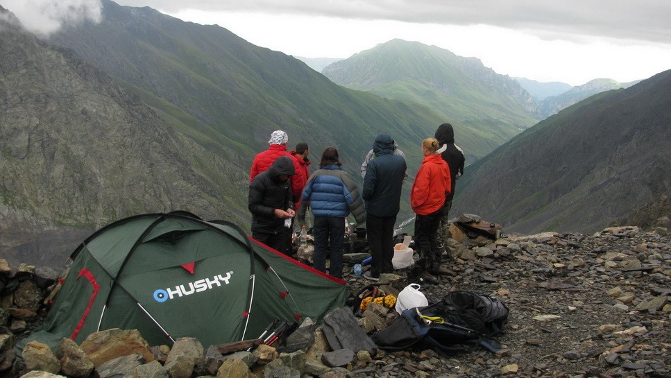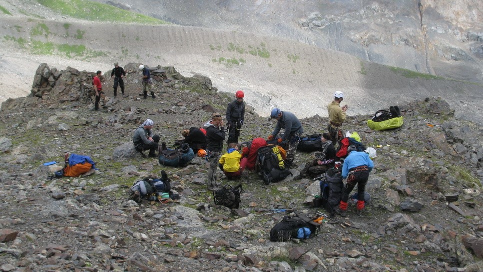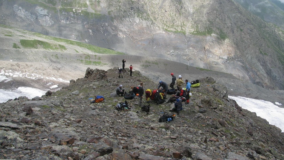 Моим деспотичным решением был немедленный спуск группы после восхождения внизу на ночевки «у креста». Было тяжело заставлять свои кости и мышцы двигаться и собирать палатку, но руководитель был неумолим и всех подгонял ))…Вскоре погода окончательно испортилась и пошел мелкий мокрый снег, ветер усилился. Но мы уже собраны и идем вниз на 3450. Еще раз принимаю всю прелесть и тепло ночевок на 3450. Ставим палатки. Уставшие, но довольные, за обедом, плавно перетекающим в ужин делимся впечатлениями о восхождении. Предвкушаем завтрашние теплые нарзанные ванны. Вечером с 18:00 пустился град-ливень, который шел всю ночь без остановки, что еще раз убедило всех в правильности быстрого спуска с п. ОЖД (4200).