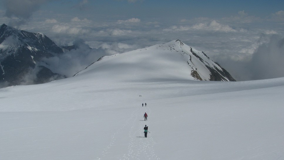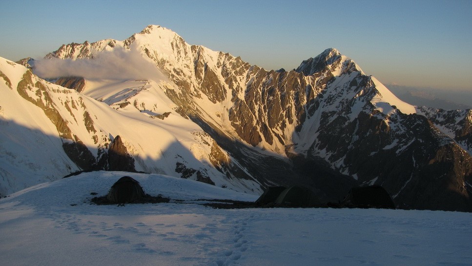 5й день программы был посвящен переходу от стоянки 3500 к стоянке 4150 у п. ОДЖ (4200 м). С рюкзаками проделать вчерашний путь было не много сложнее, но за 3,5 часа мы достигаем заснеженный гребень ОЖД. Я подумал, что: «Наверное не сезон…», снега на гребне очень много и площадки под палатку стоит расчищать. Видимость в этот день прекрасная: Казбек и массивы пиков Майли, Джимары и Шау открылись во всей красе. Брошеван (он с группой ушел на стоянку 4150 на день раньше) уже успел сбегать в этот день на гору и достиг с группой вершины. Мы же справляясь с порывами легкой горной болезни, начинаем ставить палатки. К вечеру гору немного накрывает облаками. А мы строим планы на завтрашний день. После длительной непогоды все очень волновались, о том будет ли погода на день восхождения – по плану через день. Следующий день решили использовать для более глубокой акклиматизации и тренировок. 6 день был самый шикарный погоде и практически безветренной.