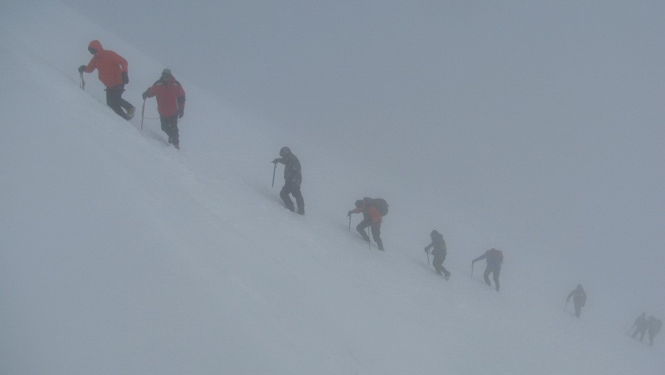 Темп и дыхание очень ровное, легкий горный бриз с небольшими кратковременными порывами, мороз -5…-10 С и ровные лучи солнца на рассвете мягко ложатся на склоны г. Казбек и Майли. Рассвет в горах поистине незабываемый и монументален по своей сути, иногда в ушах даже музыка играет… Продолжаем идти. Через 40 минут доходим к перевалу Казбекский. Отдыхаем. Одна из немногих наших девушек Юля приняла решение идти вниз из-за легких приступов горной болезни и боли в животе. В составе 13ти + Брошеван и напарник из его походной группы Виталик продолжаем идти на верх. Еще за 60 минут ходу достигаем подножья горы и выходим на тропу, натоптанную восходителями из Грузии. Тропа плавно уходит вверх вдоль западной вершины Казбек и отдаленно напоминает «косую полку» на Эльбрусе ( Казбек как и Эльбрус вулкан и разделен седловиной на две вершины восточную главную и западную). Еще через 1 час с лишним подходим к седлу Казбека. Отсюда путь до вершины короткий. Длинный привал, рюкзаки оставляем внизу. На восхождении нас сопровождал еще один наш гид Брошеван, дабы сделать безопаснее восхождении и если возникнет необходимость кого-то спускать, то спускать в сопровождении. Мы идем на Восточную вершину, а Брошеван Сергей и Виталик на западную, надо сказать что это их втрое восхождение на Казбек за последние 3 дня :)… С рассветом местами гору накрывало облака и мы шли сквозь облака, в тумане. Подъем от седла на гору занял еще около 20-30 минут по крутому снежному склону, по ступеням. И вот мы на горе!!!! Общее время восхождения группы 4 часа 25 минут от пика ОЖД.