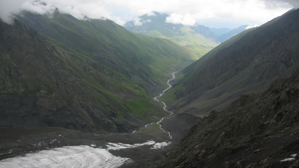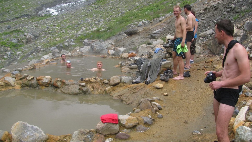 8 день. Утро пасмурное. Неспешно собираемся и идем вниз. Местами осадки, но короткие. Очень скоро выходим на морену 2700-2800 у ОЖД, где мы оставили заброску еды и вещей. Перепаковались, идем вниз к переправе. Спуск с лед. Майли аккуратно по правому борту по морене и льду ( на краю одеваем кошки). Переправа через реку Колка заняла в этот раз гораздо меньше времени, благодаря сглаженности и пониманию, которое выработалось в процессе совместного пребывания группы в горах на протяжении 8 дней. Плюс помогла заранее подготовленная страховка Брошевана Сергея (его группа шла немного впереди нас), поэтому мы просто обменялись веревками и продолжили переправу. А Брошеван спешил на нарзаны. Но очень скоро (40 минут) тепло верхних Геналдонских нарзанных ванн коснулось и наших уставших тел ))). На ваннах стоял лагерь 3х приветливых осетинов, которые очень порадовались тому, что мы спустились с горы живы и здоровы. На ваннах принимаем решение, что после перекуса выдвигаемся вниз к с. Кармадон, так чтобы утром уже уезжать в Минеральные Воды, Владикавказ и т.п..
