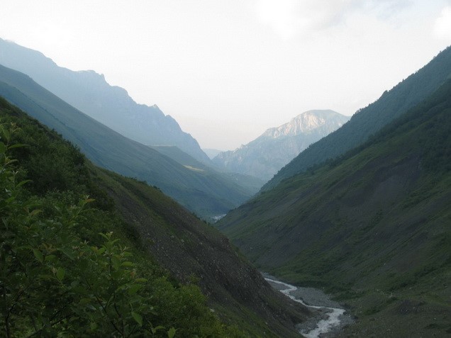 Утром проснулись не спеша. Подготовка к выходу, лишнее оставляем в селе, первичный инструктаж и выход. Особенность июня-июля 2012 – это большое количество и частые осадки, практически каждый день. Так и нам первые три дня восхождения сопутствовал дождь иногда утром, иногда, днем, иногда вечером. Дорога на ледник Майли, который стекает с Майли-Казбекского плато идет по левому берегу реки Геналдон (в 2002 году в ущелье из-за обрыва ледника Колки сошел сель, который снес часть сел внизу и съемочную бригаду С. Бодрова)…