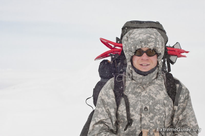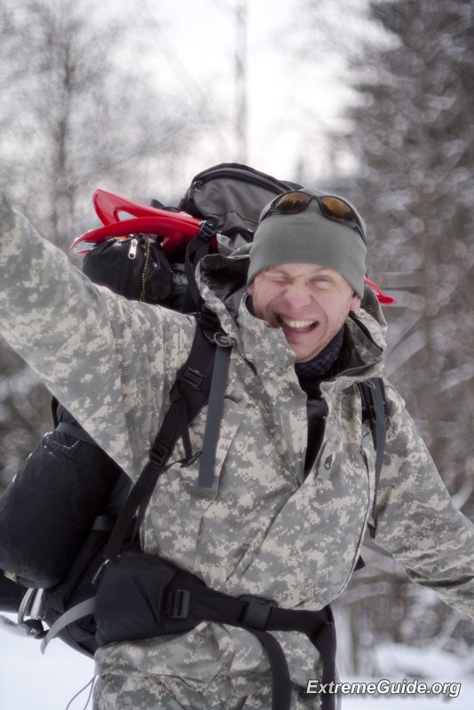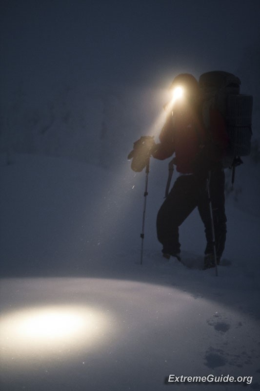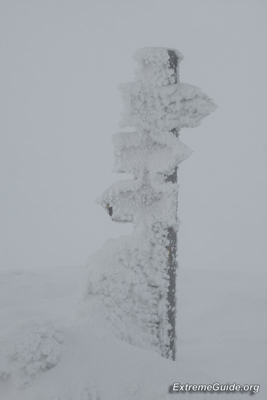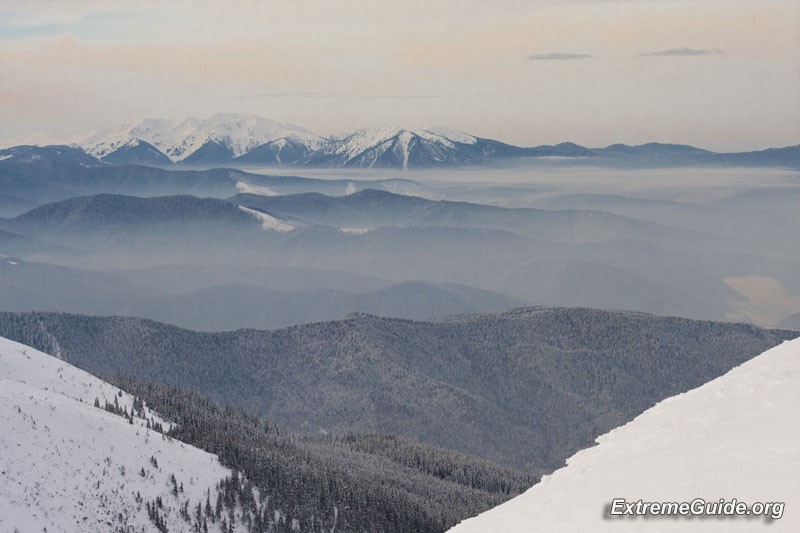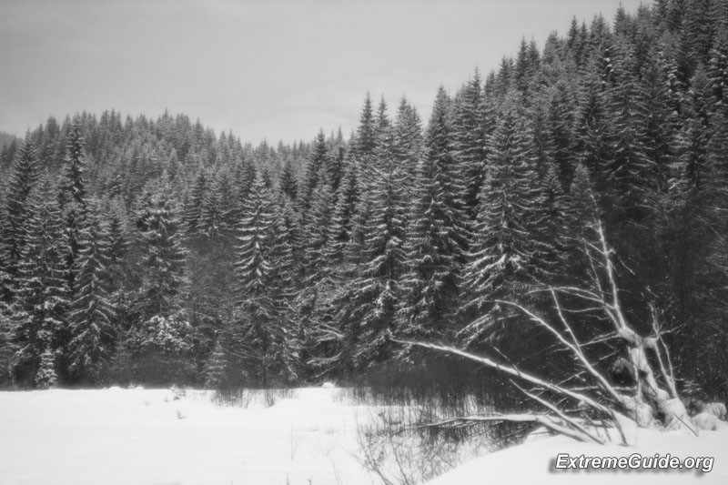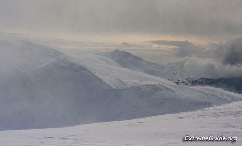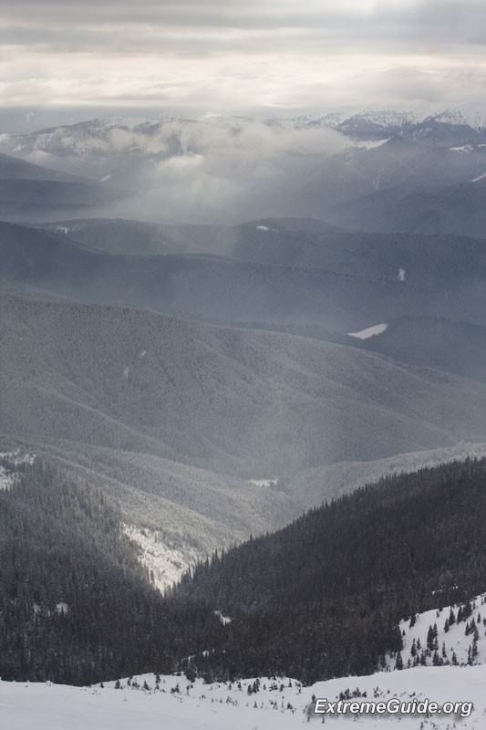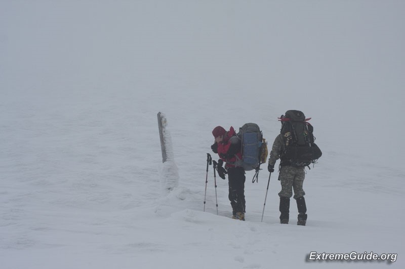 Просыпаемся в 6 утра, и сразу обращаем внимание на то, что всю ночь шел снег, и вместо 5 сантиметров, которые были по прогнозу выпали все 30-40. Тропа к вершине полностью заметена не смотря на то, что вчера вечером по ней прошло более 20 человек. Пускаем вперед Макса, потому что только у него были снегоступы, и начинаем движение. Путь на Говерлу занял четыре часа, за которые мы упахались от и до. На высшей точке Украины, как и почти на всем нашем пути, видимость была низкая, иногда падая до 10-20 метров, как раз что бы просматривать гребень и обходить вероятные карнизы. После перекуса на Говерле, продолжили движение по хребту, то вверх, то вниз, то не проваливаясь в снег, то проваливаясь. Склоны вершин не травесировали, шли четко по гребню, из-за плохой видимости и страха спустить снежную доску. Двигались просто, выбирали на GPS азимут и придерживались его, иначе никак. Мы прошли Брескул, Пожижевську, Данціж, но на подходах к Туркулу начало темнеть, потом пошел не сильный снег и мы стали на стоянку. Темнеет зимой рано и мы еще долго надрывали животы рассказывая анекдоты, пока не уснули.