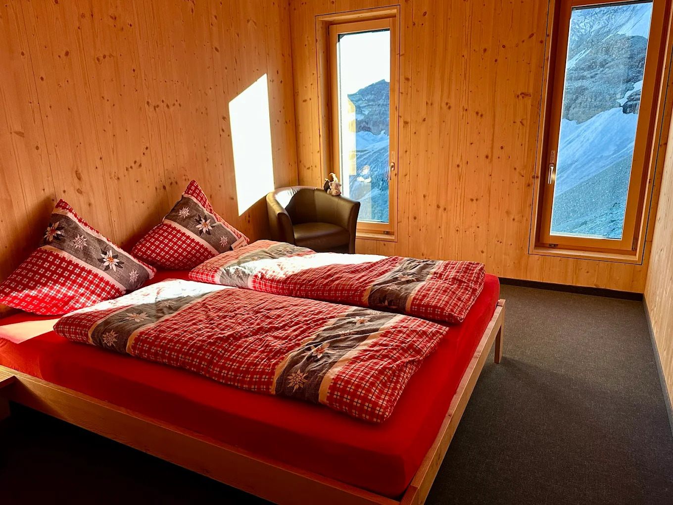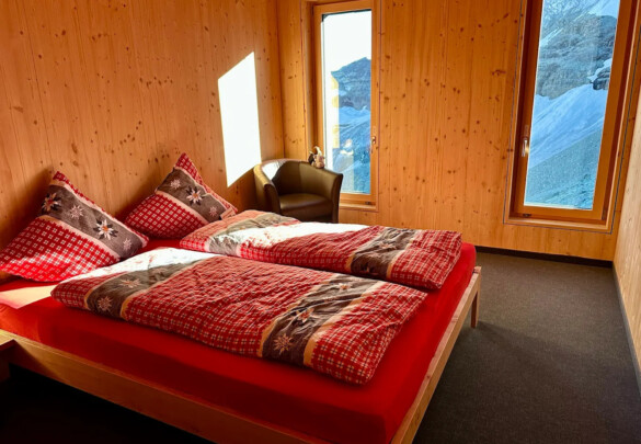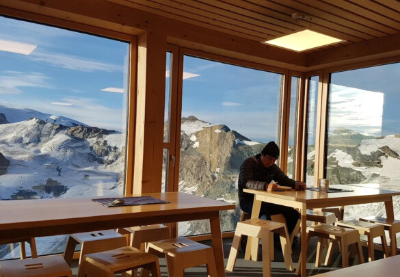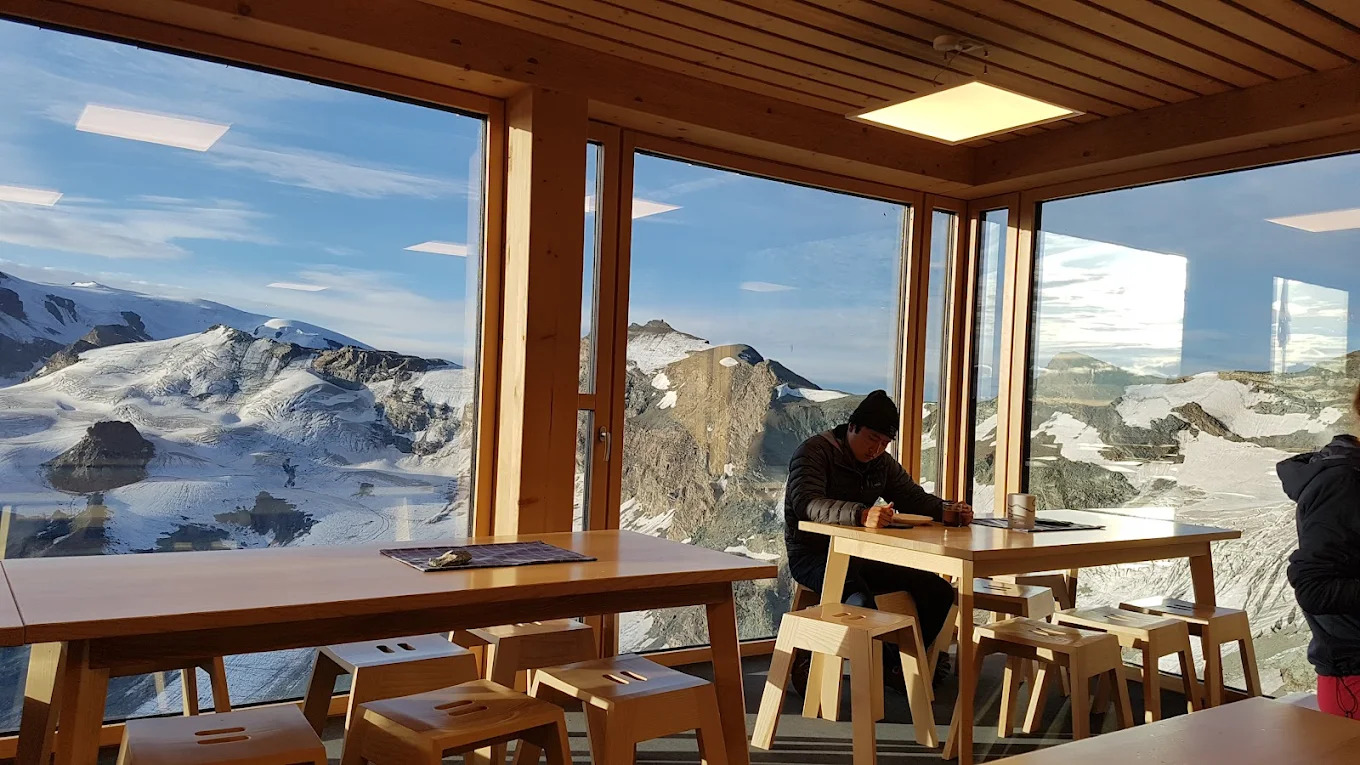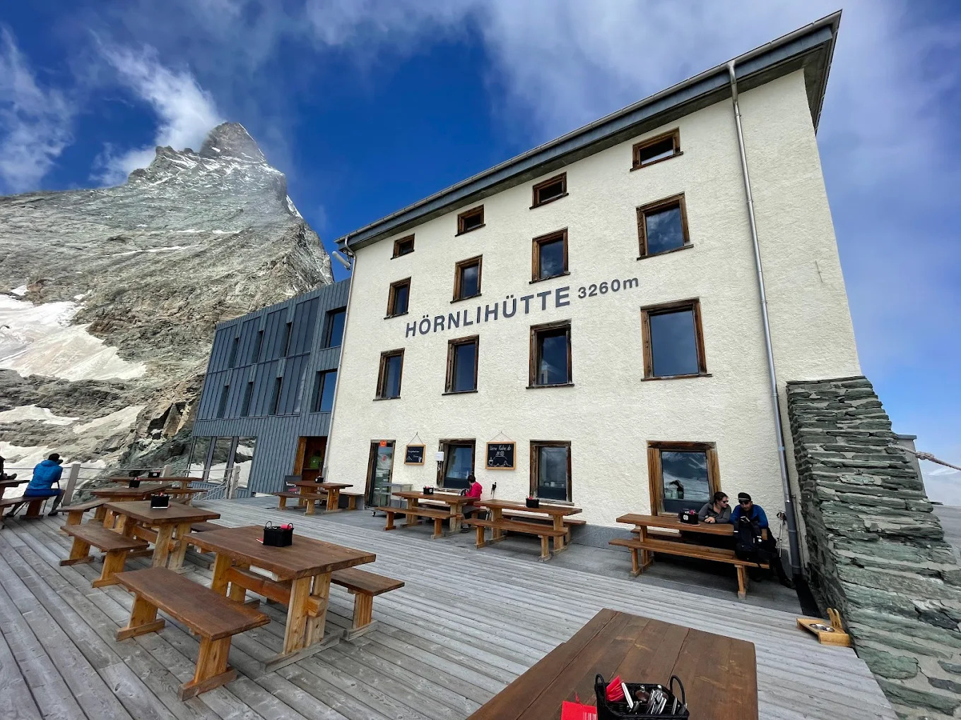 Хижина Hörnlihütte (3260 м, Швейцария) расположена у подножия Маттерхорна и является стартовой точкой классического маршрута восхождения. Работает с середины июля по сентябрь. Вместимость около 130 мест в дормиториях с одеялами и подушками, требуется собственный вкладыш. Душа и горячей воды нет, туалеты базовые, есть сушилка и хранение снаряжения. Питание предлагается в фиксированные часы — ужин и завтрак; есть вегетарианские блюда, но не веганские. Бронирование обязательно заранее.