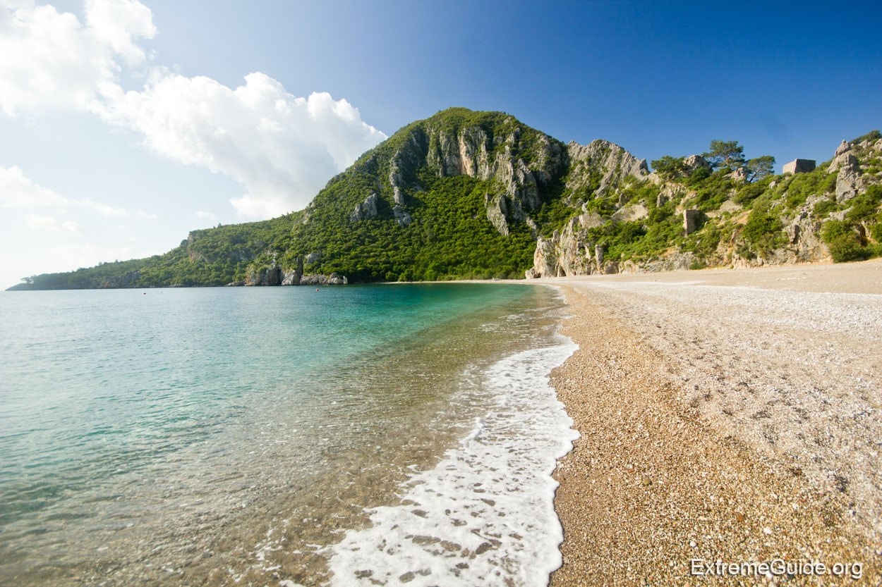 Маршрут проходить західною її частиною вздовж середземноморського узбережжя. На цьому відрізку маршруту розташовані затишні скелясті бухти, красиві безлюдні пляжі із чистою бірюзовою водою, старовинні пам’ятки лікійської цивілізації. Саме тому ця частина Лікійської стежки вважається найкрасивішою. Клімат відрізняється своєю м’якістю, за що ці місця ще називають турецькою Рів’єрою. Температура не опускається нижче +8 навіть у зимову пору року, так що найсміливіші зможуть ще й викупатися. Детальніше