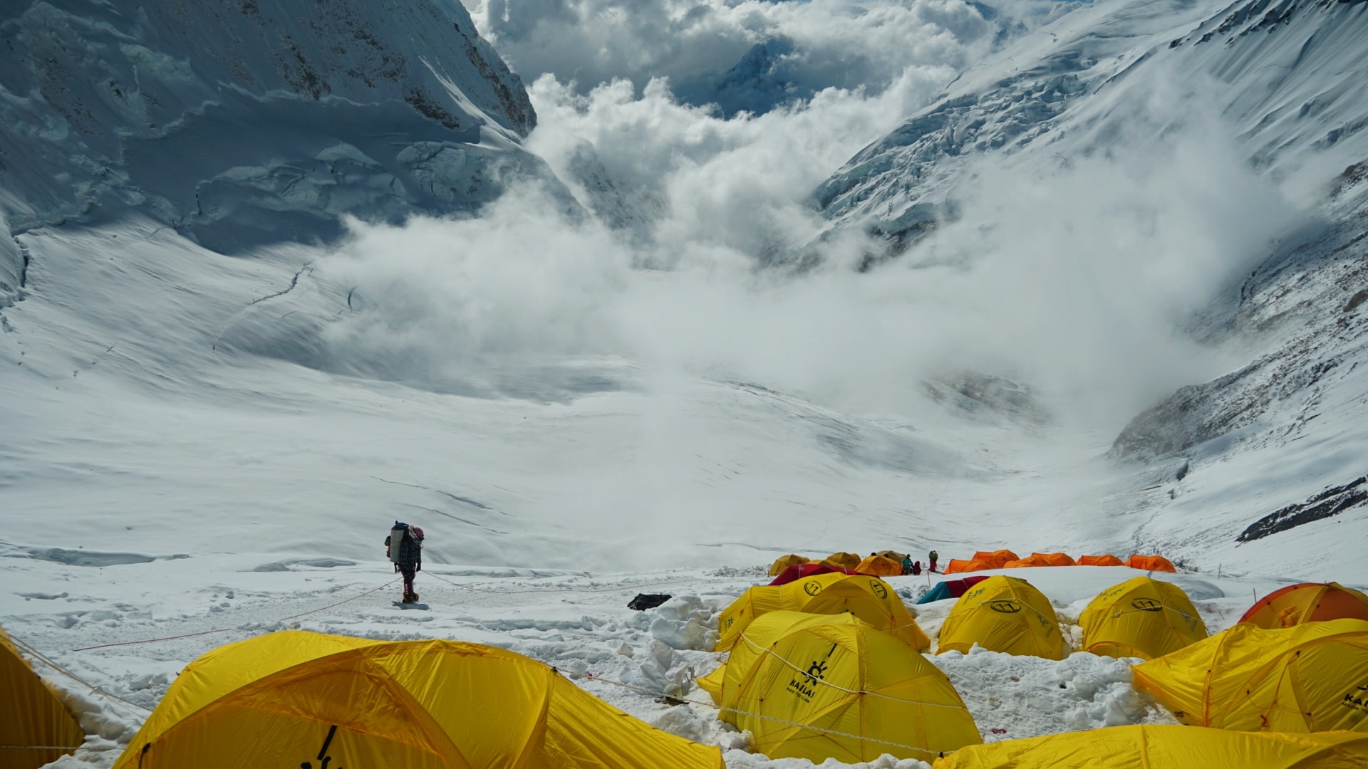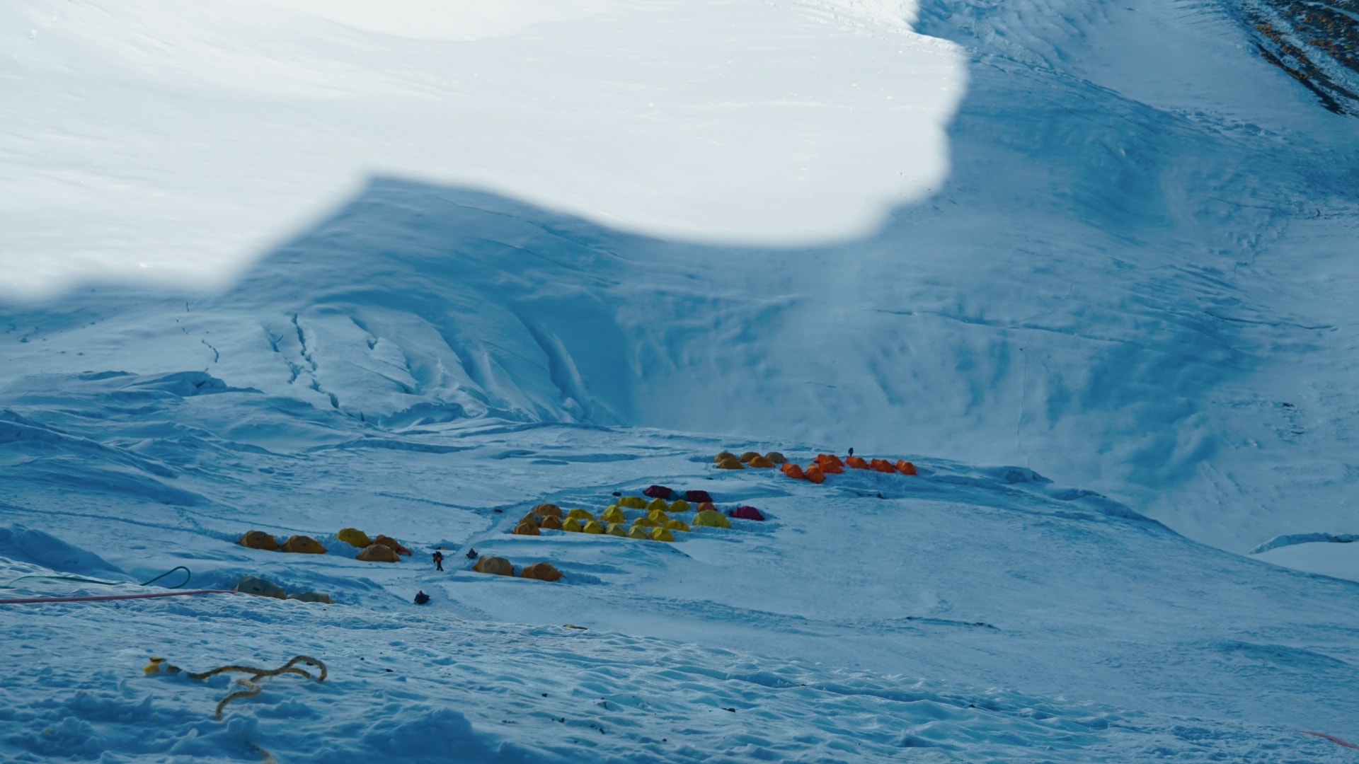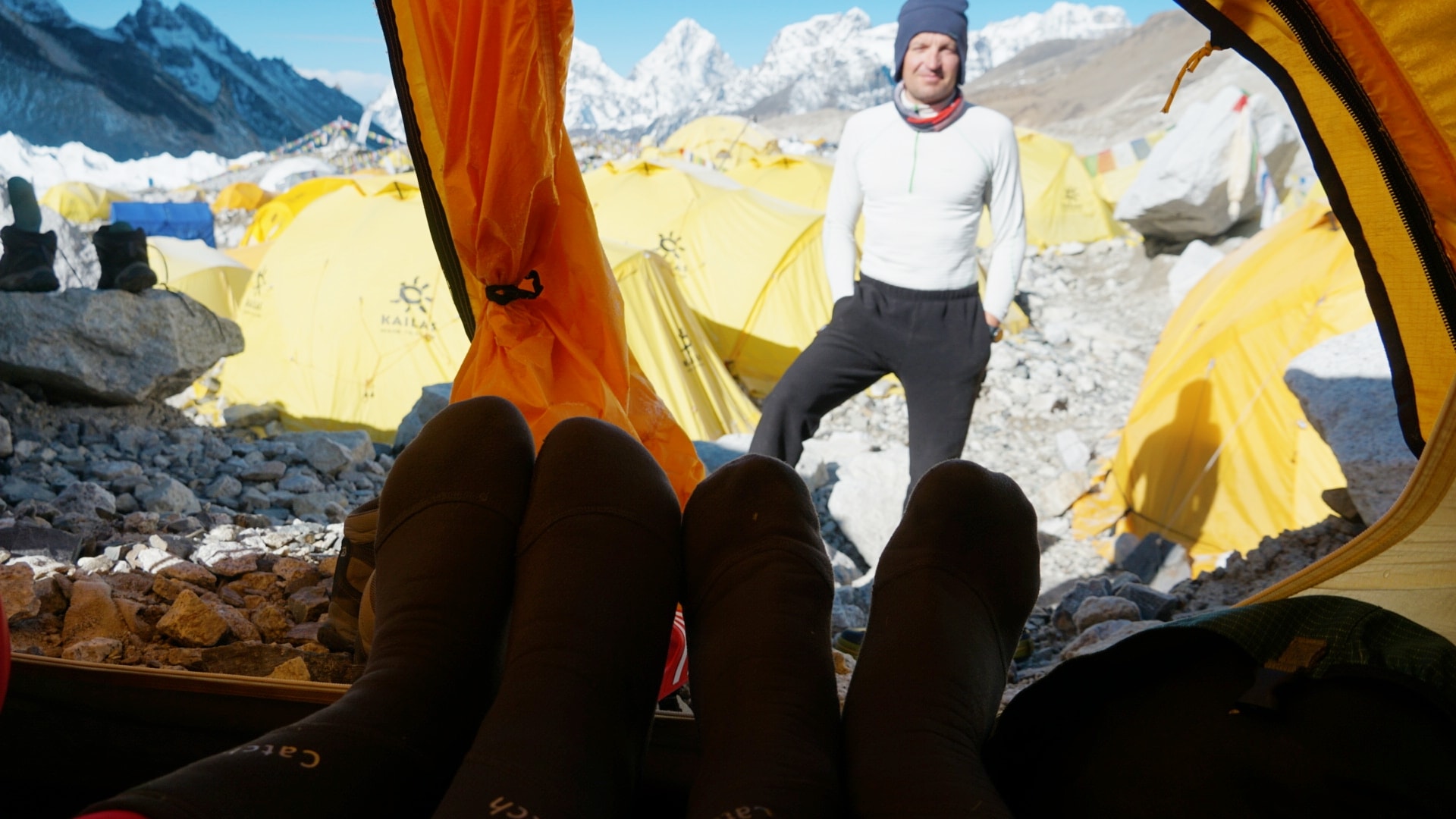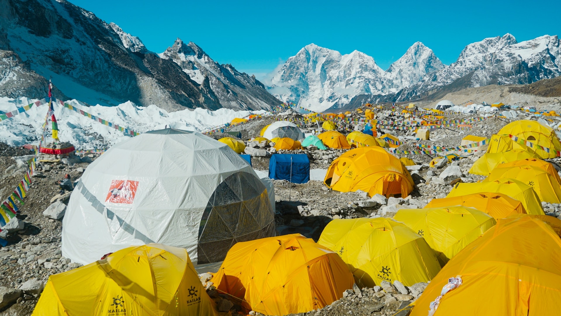 Базовий табір – у сезон сходжень на Еверест нагадує ціле місто, понад тисячу наметів для туристів та обслуговуючого персоналу, їдальні, кухні, склади, вертолітні майданчики. Загалом цього року на льодовику Кхумбу розташувалося понад десяток таборів різних компаній. Всі табори різні за комфортом та розмірами.