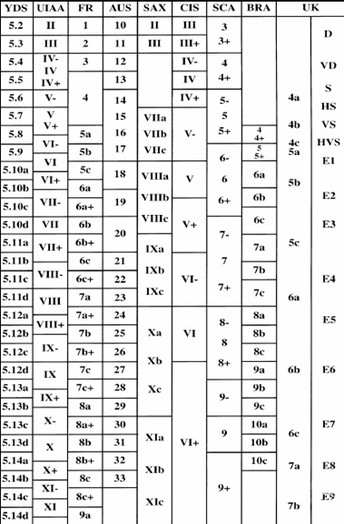 Справжній рівень скелелазіння починається з 5-го класу. Для більш детальної градації труднощі використовується дробова частина, а починаючи з рівня 5.10 додаються літери a, b, c і d. c – 5.10d – 5.11a – 5.11b – 5.11c – 5.11d, і так далі, аж до максимального рівня 5.15d