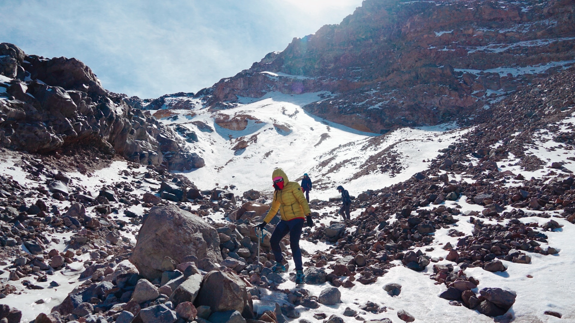 Перші 300 метрів йдуть кам’янистою стежкою. Вище одягли кішки, щоб пройти пояс зруйнованих скель “лабіринт”. На 5100 року почався льодовик, де ми поділилися на зв’язки. З нами на сходження вийшло ще 2 місцевих гіда.