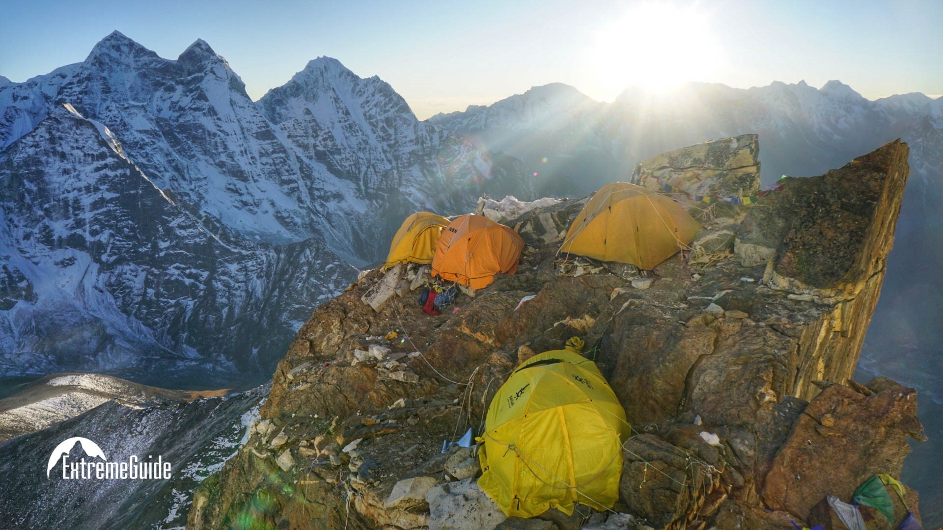 Намет для сходження ми взяли в оренду в Пангбочі, але після ночівлі в БЛ віддали її портеру, щоб він спустив її вниз. Для Табору 1 та Табору 2 ми забронювали вже встановлені намети і навіть килимок, тому що у Сашка його надувний килимок в одному місці порвався та зламався клапан. У Таборі 1 ми провели одну ніч. Вихід до Табору 2 запланували не дуже рано і десь о 10:00 розпочали підйом. Планували зайти за 4 години, а вийшло близько 6,5. Прийшли в табір пізно та втомлені. Дуже важливо йти на гору у хорошому фізичному тонусі, готуватися до гори. Учасник Адіб поламав руку за два місяці до старту і, мабуть, не встиг до кінця відновитися. Йому було важко на підйомі особливо на вертикальних ділянках, тому йшли повільно. На превеликий подив коли ми прийшли в Табір 2, в наметі який ми забронювали заздалегідь, ми знайшли чиїсь речі (групи шерпів яка тільки спускалася з гори). Час уже о 17:00. Я захвилювався, з собою у нас намету немає, та й ставити його нема де. Німс та його команда зайняло все, оскільки у них за планом сходження і їх дуже багато, у них місія розтягнути прапор Кувейту на вершині Амадабламу. У нас за планом у ніч теж вихід на гору. Діти ще не підійшли. Знайшов Німса, що врятувало ситуацію він знайшов нам місце під намет і віддав свій резервний намет.