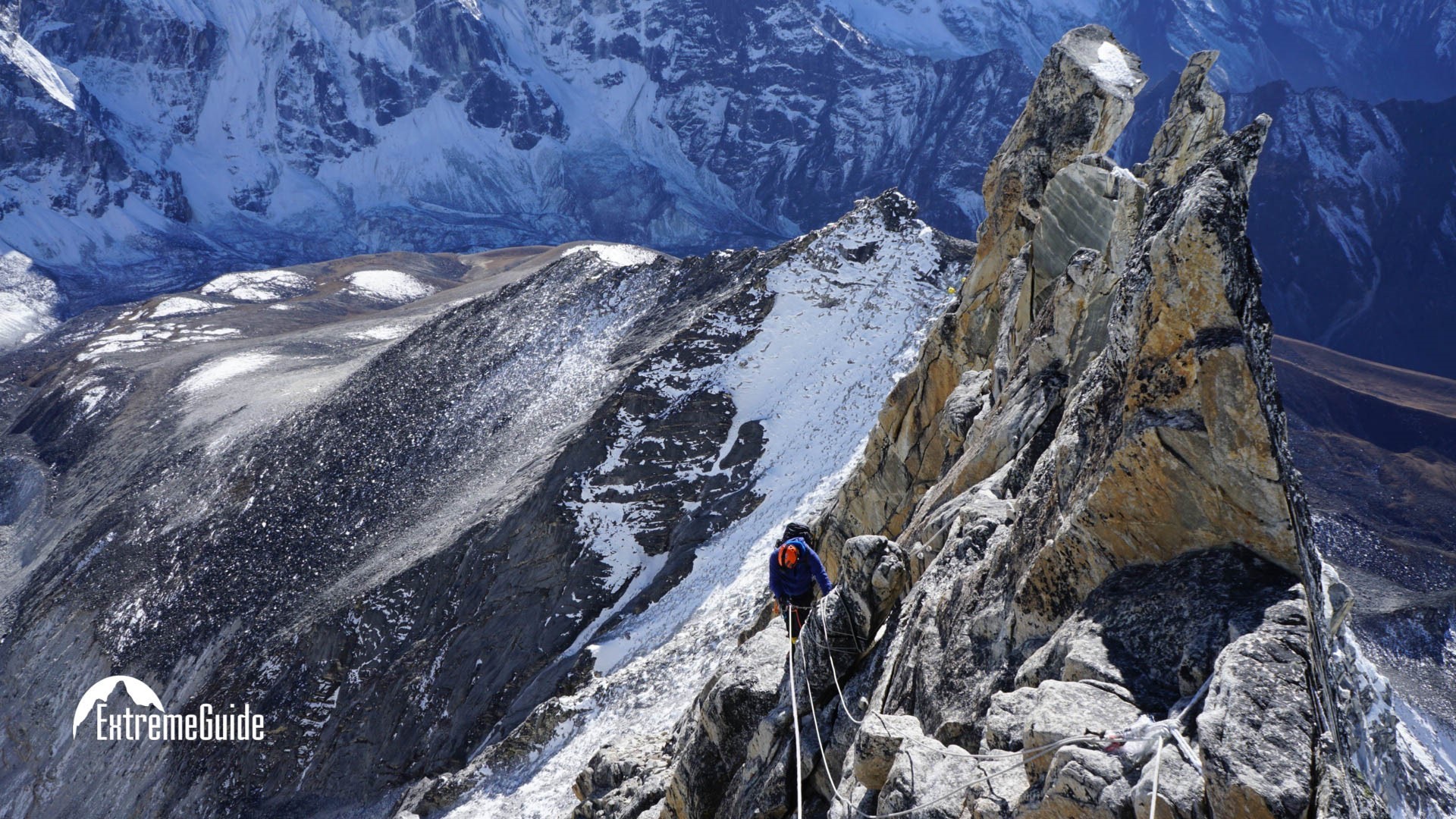 Вихід на гору ми запланували о 0:00. Напередодні добре поспали. Від Табору йде одразу різкий зліт по скелях та льоду до головного бастіону, вихід на льодовий гребінь Амадаблам. Підйом не дуже крутий, але жумарити в кішках по скелях, вночі не завжди зручно. До того ж завжди лотерея в якусь мотузку стібати, благо старі та биті порізали і зараз майже на всьому маршруті висять нові мотузки beal. Адіб так і не відновився, ми Сашка відпустили вперед і тримали зв’язок по рації. Досвід, кваліфікація дозволяла відпустити його (40 років гірських походів 5-6 к.с, сходження на 6000+м) самостійно вперед і наглядати за Адбібом. Чим вище, тим складніше йому було і дійшовши до висоти 6240 м, дочекавшись світанку ми вирішили йти вниз. І загалом було правильне рішення. Сашко продовжив свій підйом і за 9,5 години досяг вершини. Браво, 64 роки!