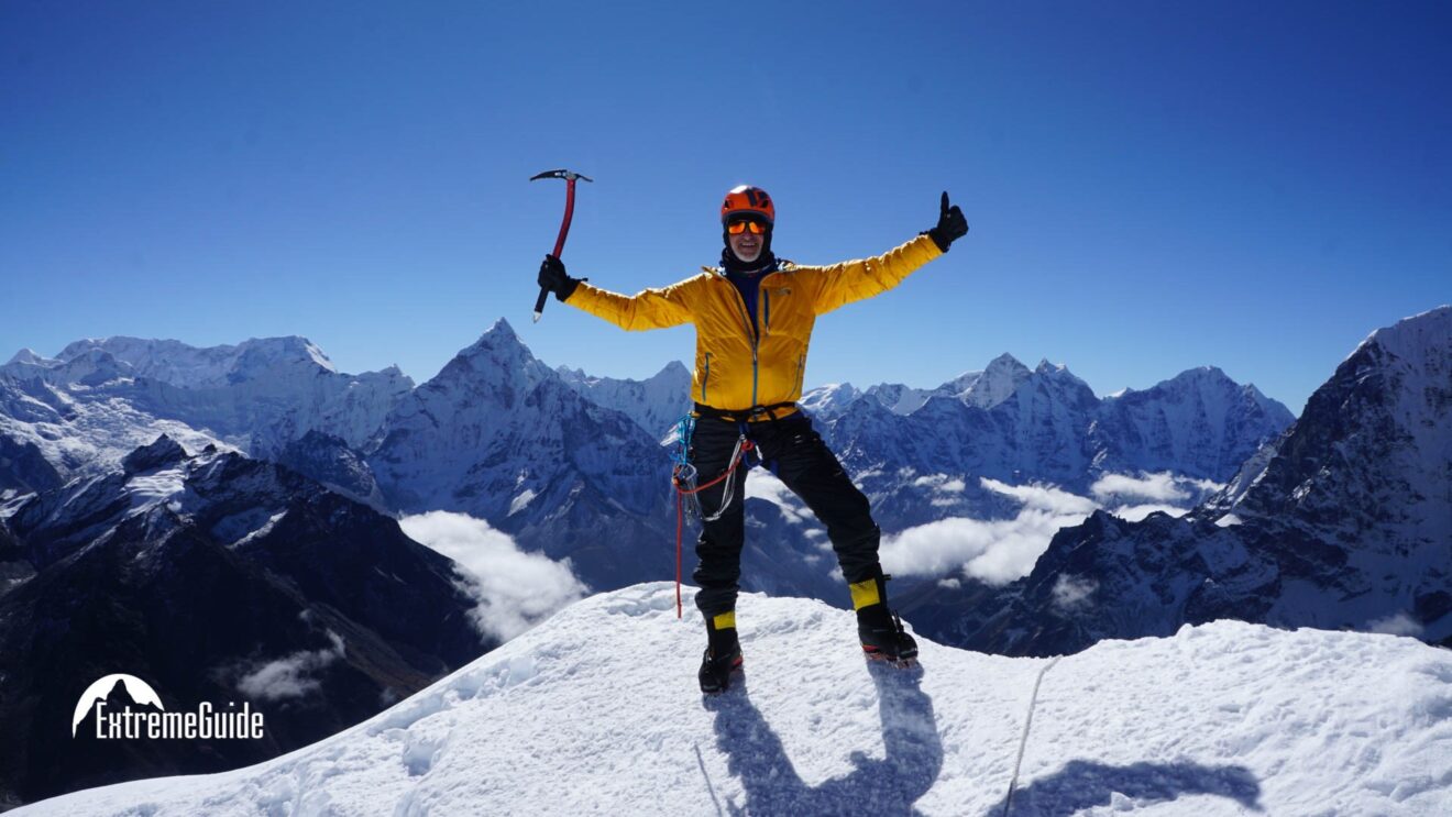 Звичайно, за основу ми взяли другий варіант акліматизації. Як підготовчий, акліматизаційний пік ми вибрали Лобуче пік. Висота якого майже 6200 м. Для сходження на цю вершину так само необхідно оформляти перміт, як втім і на всі вершини в Непалі, вище 5500 м. Зазвичай всі піднімаються до передвершини, висота якої 6000 м. Вище ходять рідко, тому що стежка йде по вузькому снігу . Так як у нас не було завдання воратися, а зробити акліматизацію та потренуватися жумарингу на довгих ділянках. До того ж середній ухил Лобуче приблизно схожий на середню крутість верхньої частини піку Амадаблам. Гора як і всі популярні “трекінгові” піки Непалу в сезон провішана мотузками. Середня крутість схилу 40-45 град.